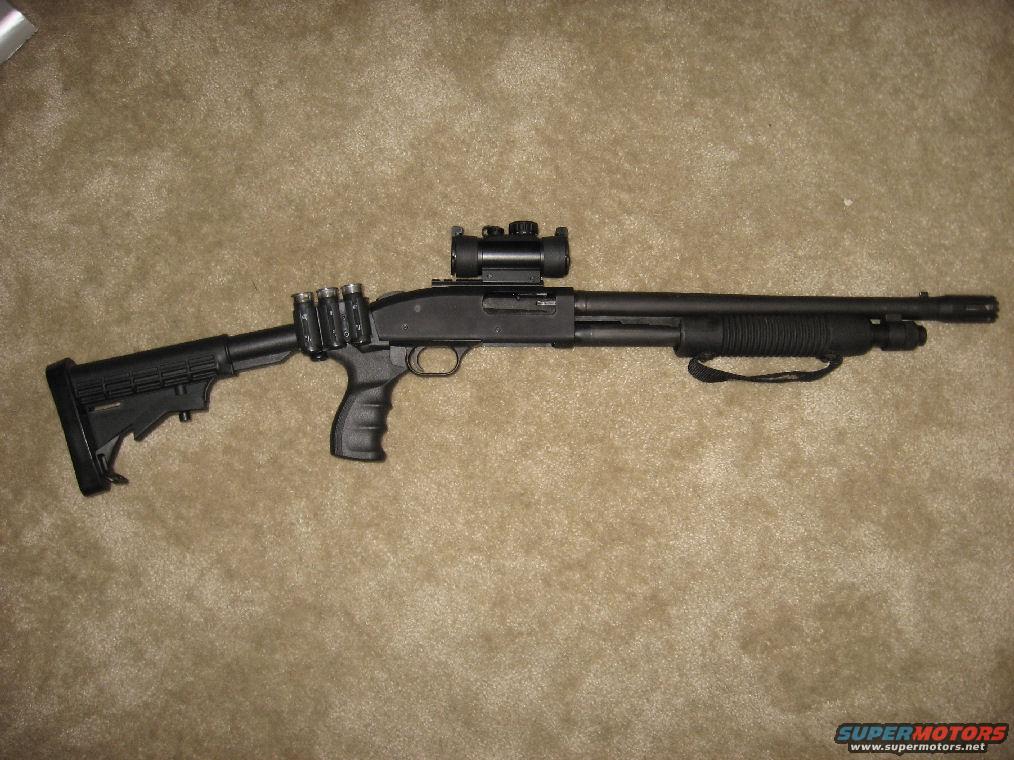 Mossberg 500 Tactical Cruiser, Pro-Mag collapsible stock, Tru-Glo red dot sight.