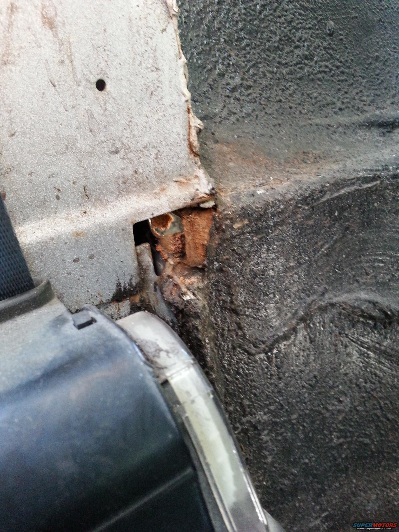 this is a shot of the passenger side from the rear seat near the seat belt. This hole was covered up with some sort of foam from the factory that had started to disintegrate. It's a pretty decent sized hole.