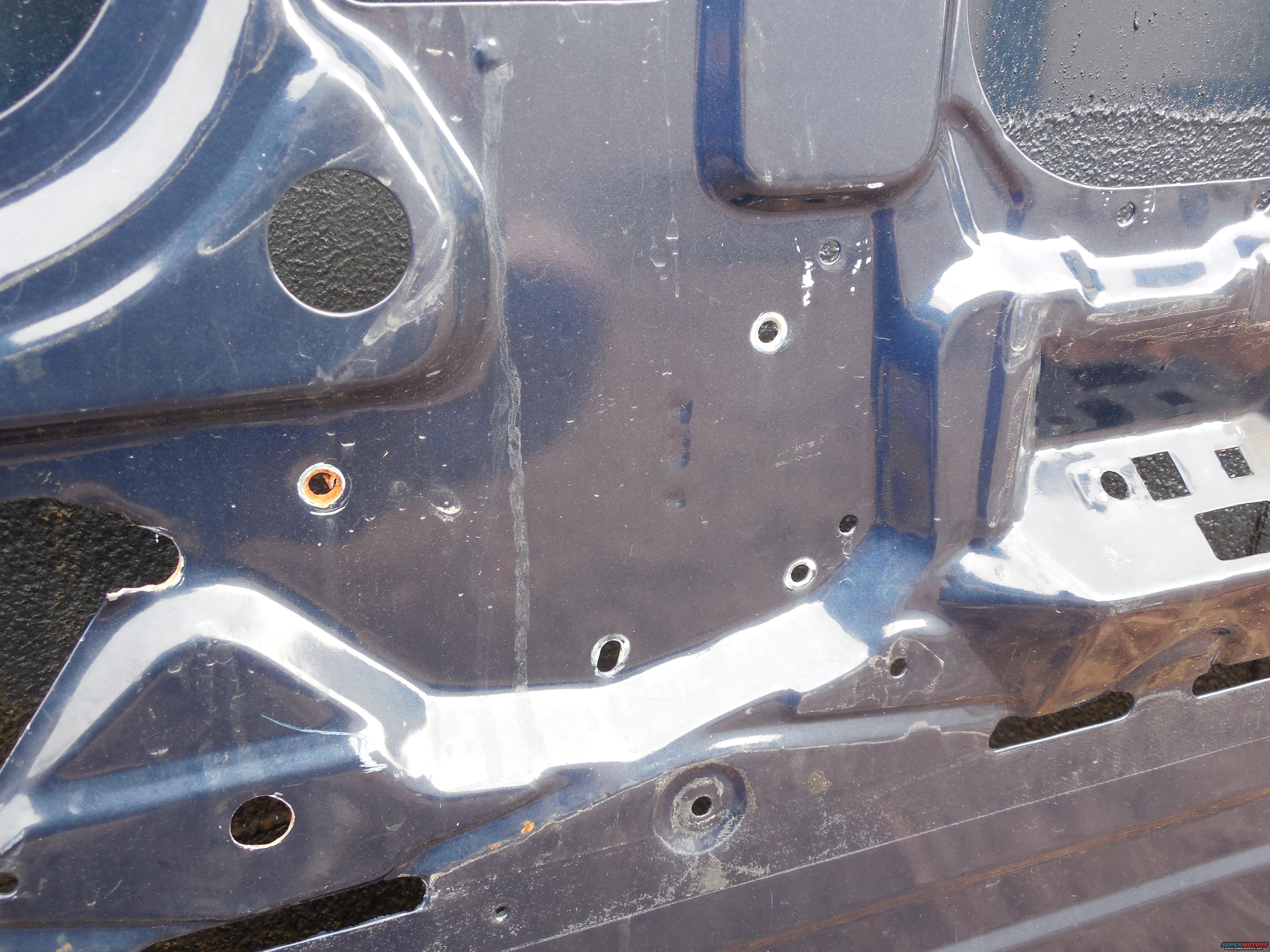 The rough-edged slot and drilled hole near the bottom Left of the pic are to access the window motor's bolts.