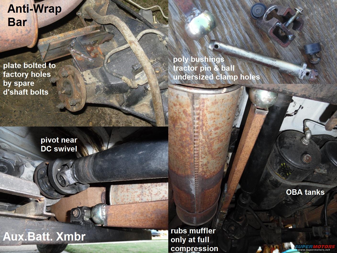 After a year of procrastinating & screwing around, I decided to finish the anti-wrap bar today. Unlike typical "traction bars" which limit articulation & don't necessarily match the suspension's normal travel, this single central bar has neither of those problems. And it only uses 2 cheap poly bushings. If they, or the pin, or the ball ever wear out, they'll be easy to replace. And since I used common fasteners, it's easy to R&I for other service.