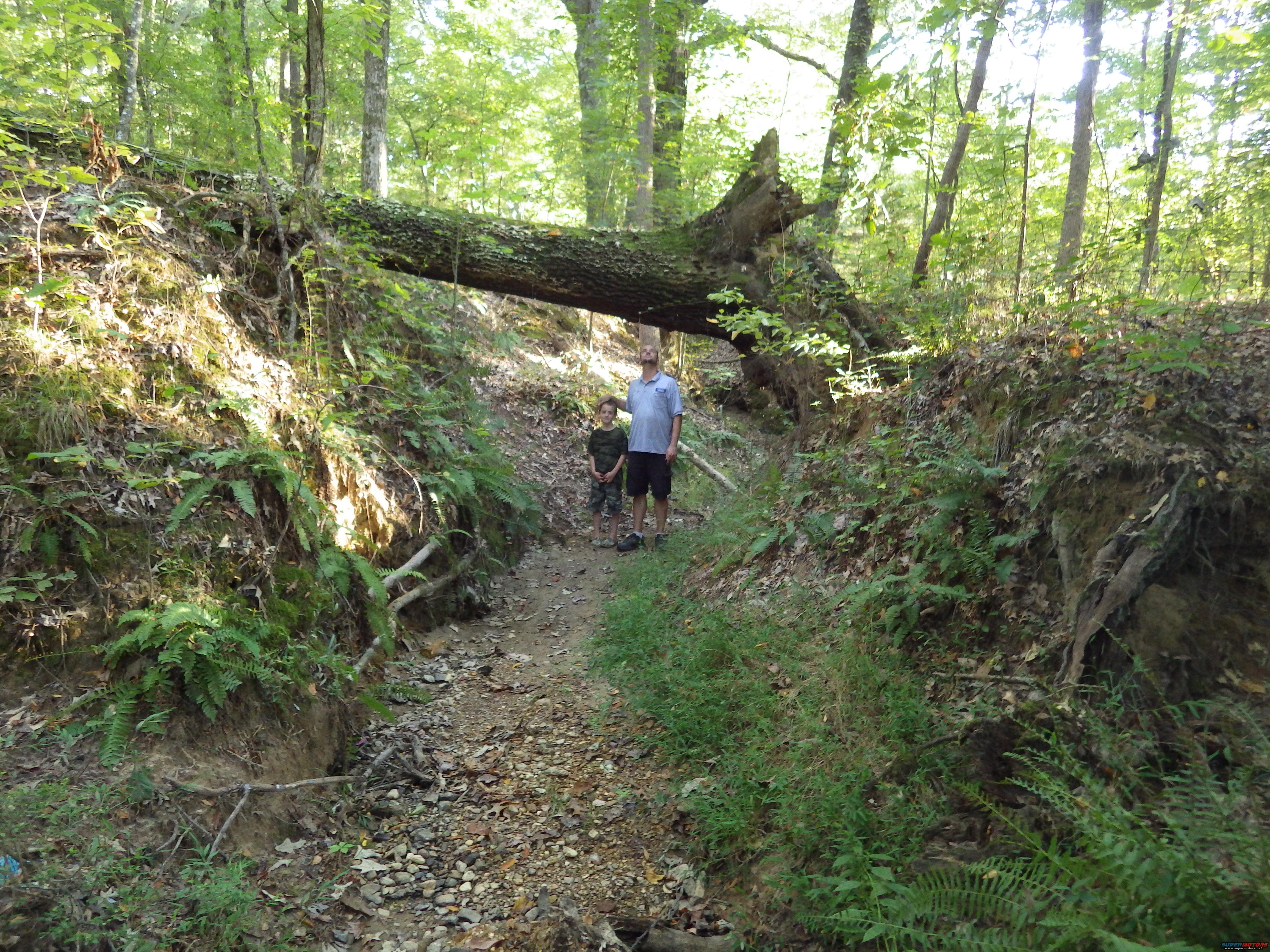 This is the trail we want to open: down into the creek from the Left, then turn Right (toward camera) and drive along the creek bed UNDER the fallen log, and out the other side to the Right.