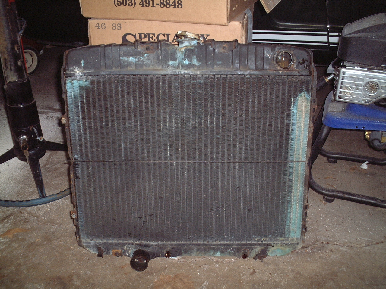 Radiator removed -- looks like it'll need to be plugged or replaced (notice the corroded fins in green).