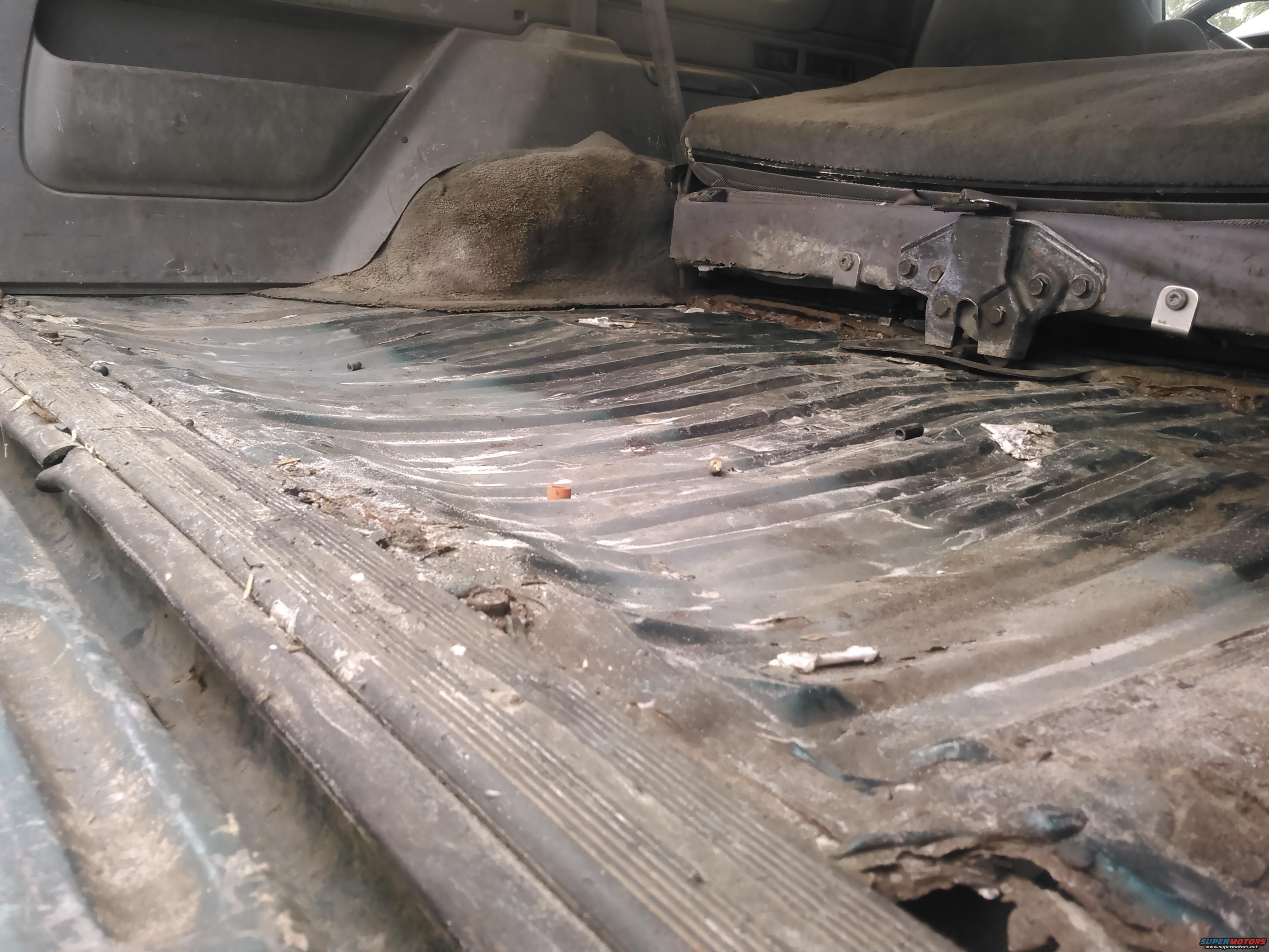 you can see how badly my floor has been crushed. this is from carring all my tools while severe offroading. i now cover the floor with a 3/4inch sheet of wood. because of this i am not worried about patching the floor