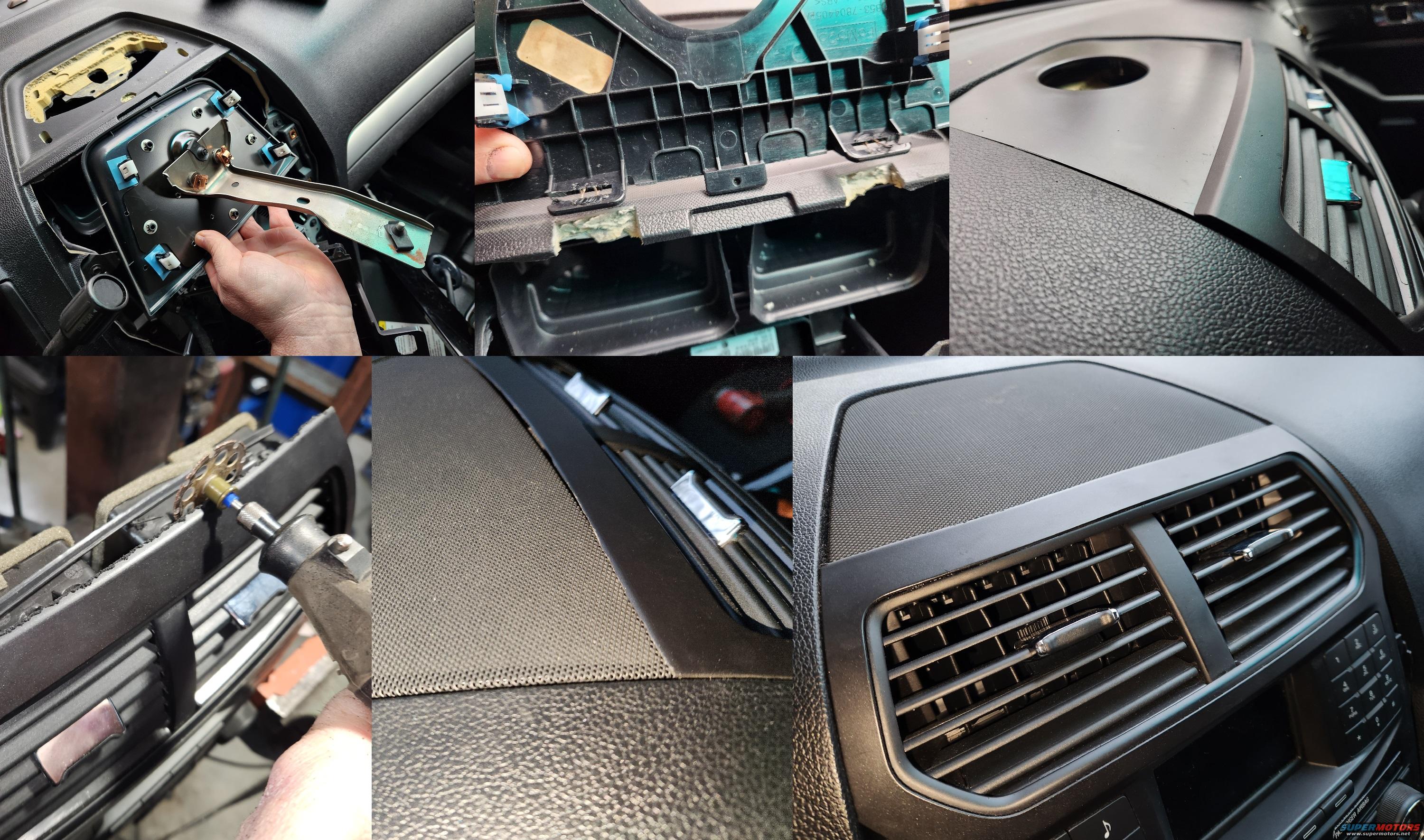 I had no use for the dash tray, and I didn't like the look of the screw holes in it, so I got a speaker grill from the JY, removed the speaker, and modified the top edge of the center stack panel. Most people try to modify the speaker grill, but most of them end up looking rough to me. My cut isn't necessarily any smoother, but it's not visible. I reinforced the guide holes before cutting them, because the speaker's tabs are spread wider than the tray's.
