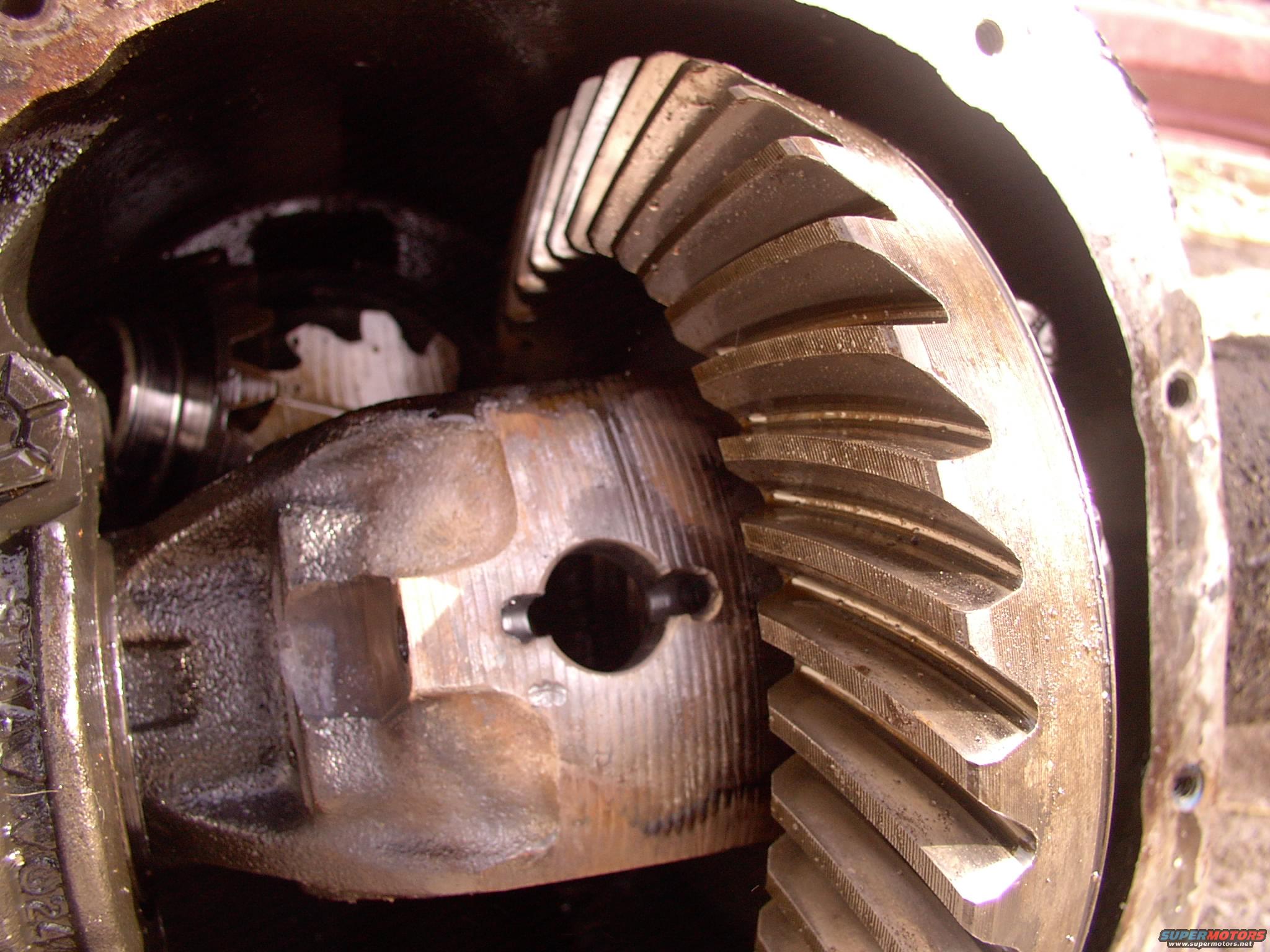The result wasn't pretty but it sure did the trick and allowed us to drift the pin out. Notice how the small locking bolt ended up pushing throughthe carrier housing rather than break. Might have been noble except the end had sheared off and caused this in the first place!