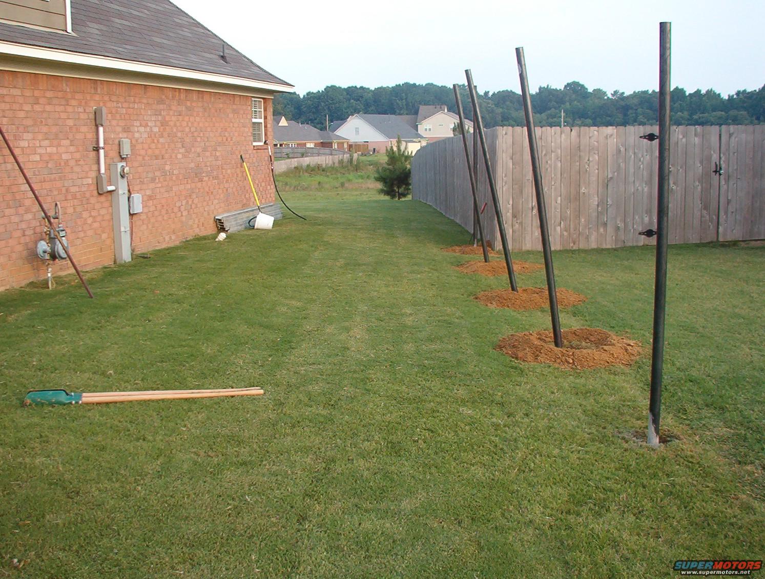 It took several hours riding a 1-man auger to get these holes drilled - apparently, the farmer who owned this land leached everything but the clay out of the ground, so it's like concrete for the top 3 feet. I'm using half-joints of 2" Sch.40 pipe for an 8' fence, so I had to go ~4' down.