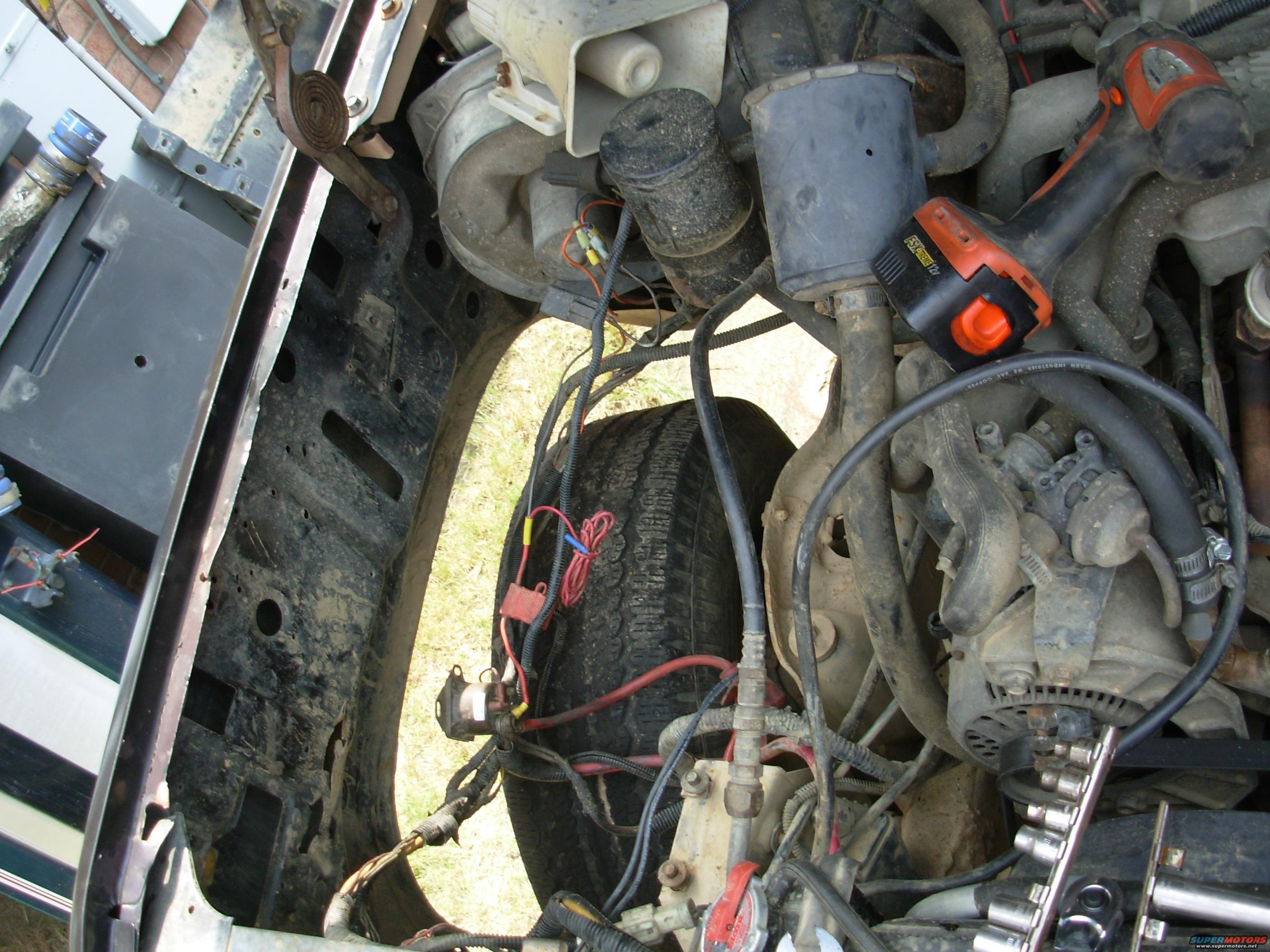 First, I removed the battery, tray, starter relay, PA, coffee can, 2ndry air intake, & wheelwell for better access to the fender bolts.