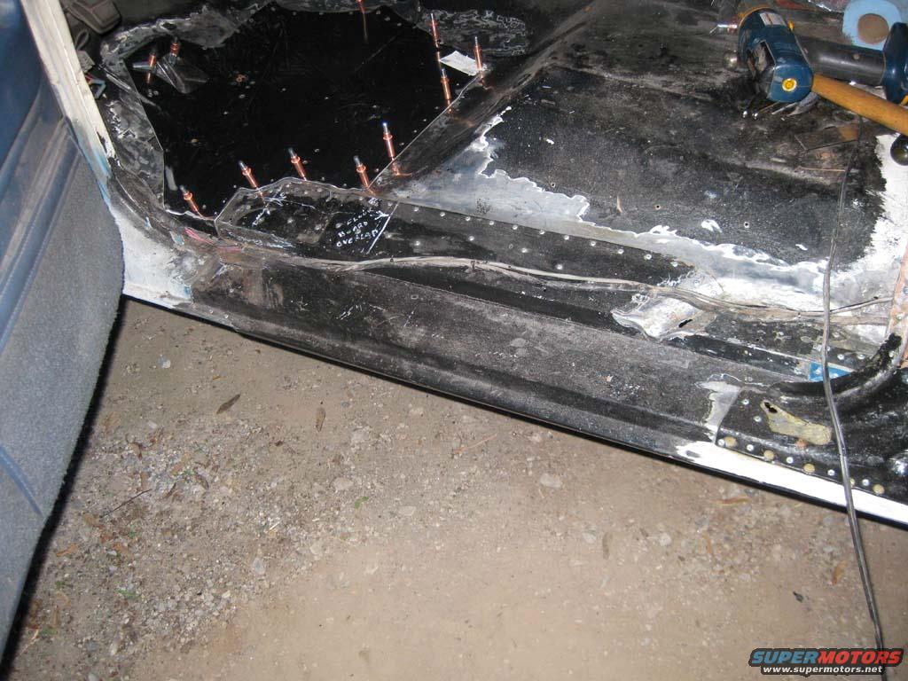 Pieces attached and ready for rust converter and sealing. Inside, on the floor I did the following: 1. I put rust converter down 2. After the rust converter cured I put down a heavy layer of undercoat. 3. spray painted over the undercoat with flat black paint. 4. when cured, I added an asphalt sound deadening blanket. 5. A thermal blanket. 6. Finally the rug.