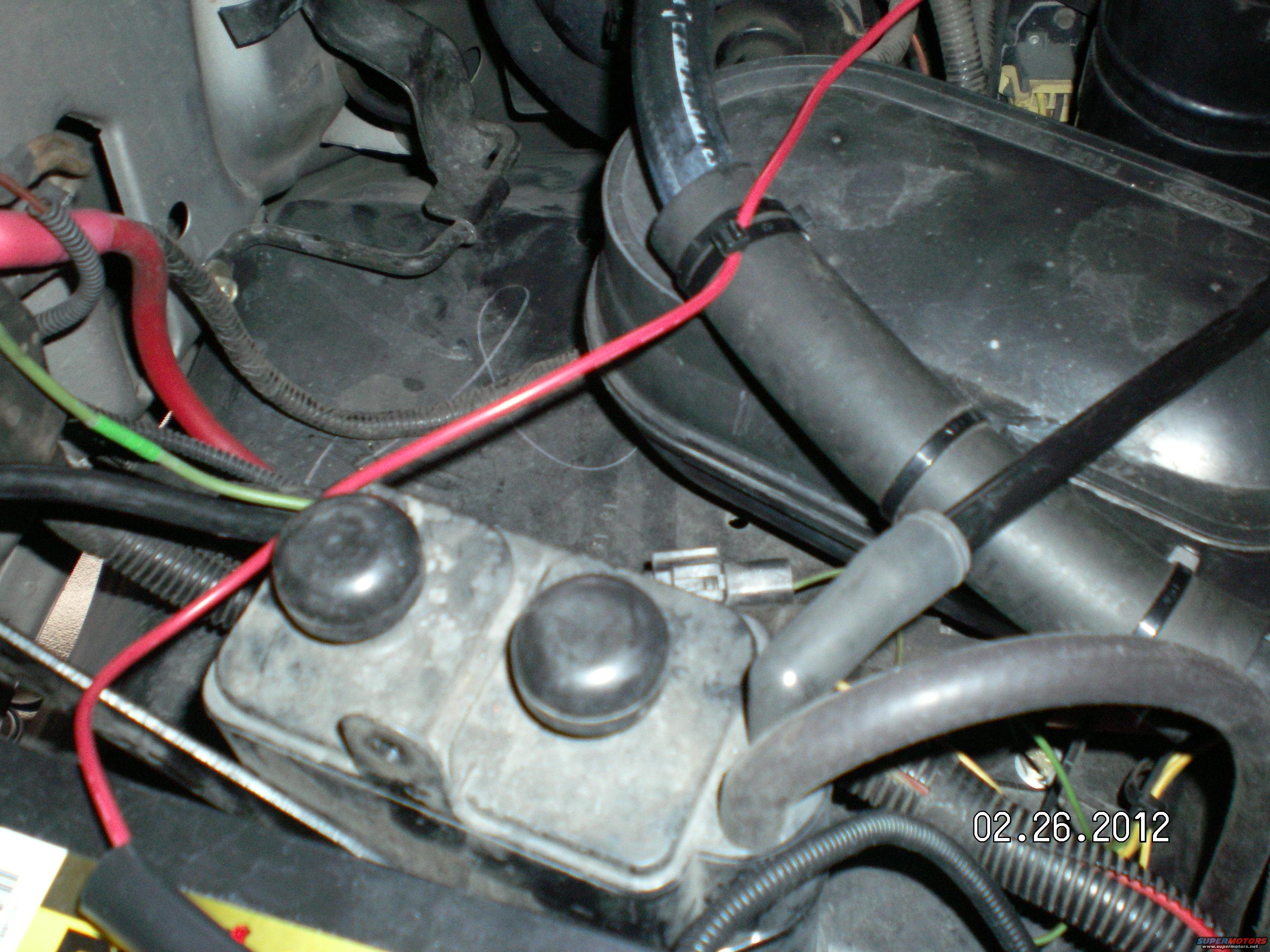 This is where I moved the charcoal canister to mount the aux trans filter. I just zip tied the canister to the battery support bracket and cut about 5" off the plastic hose and swapped the rubber 90 deg hose end onto it. The other rubber hose I replaced with some heavy duty silicone hose....The red wire is my toggle switch for my electric fan till my fan controller comes in next week.......