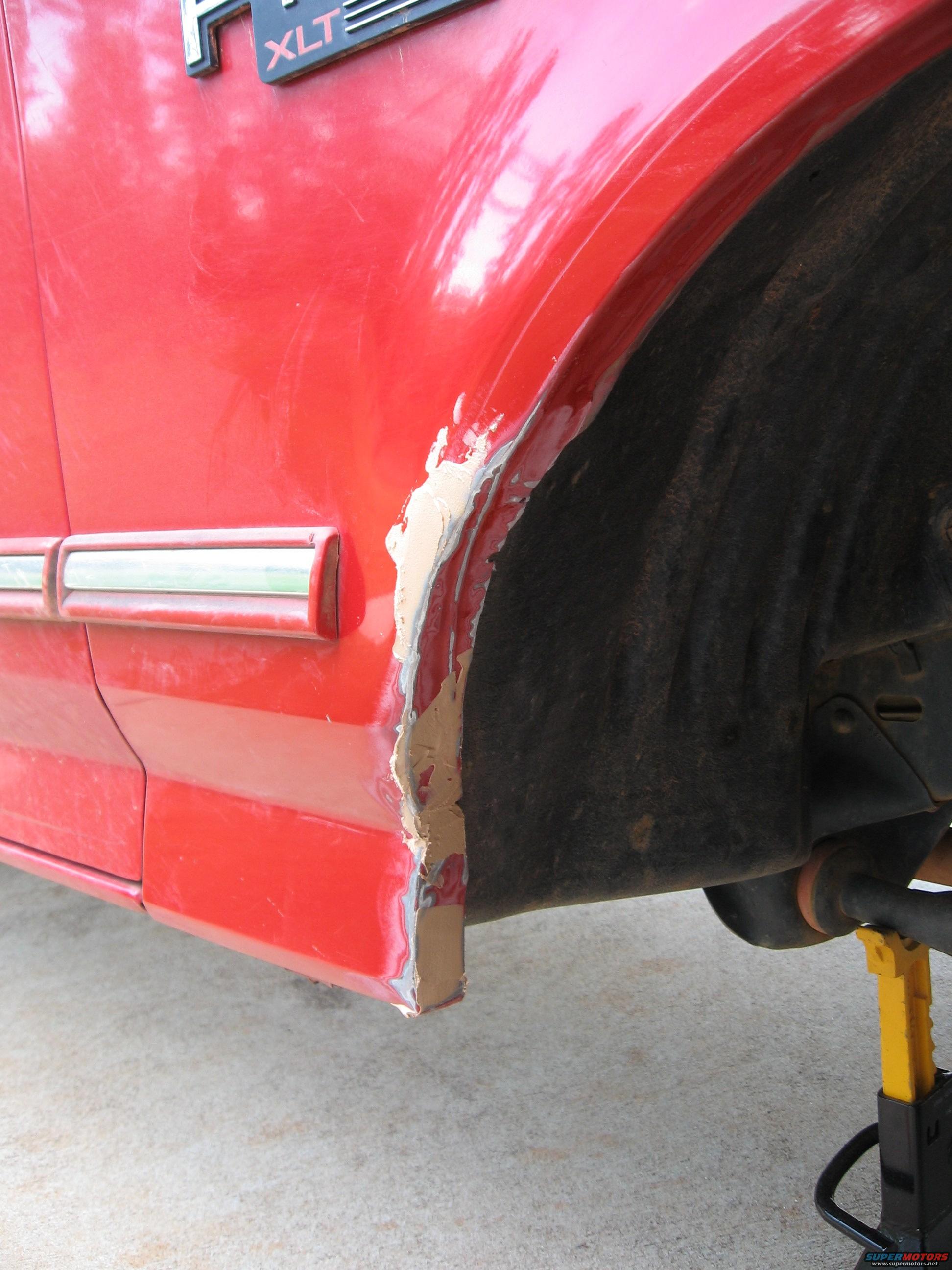 Bondo applied in thin coats to cover small imperfections. Don't go overboard with the bondo.