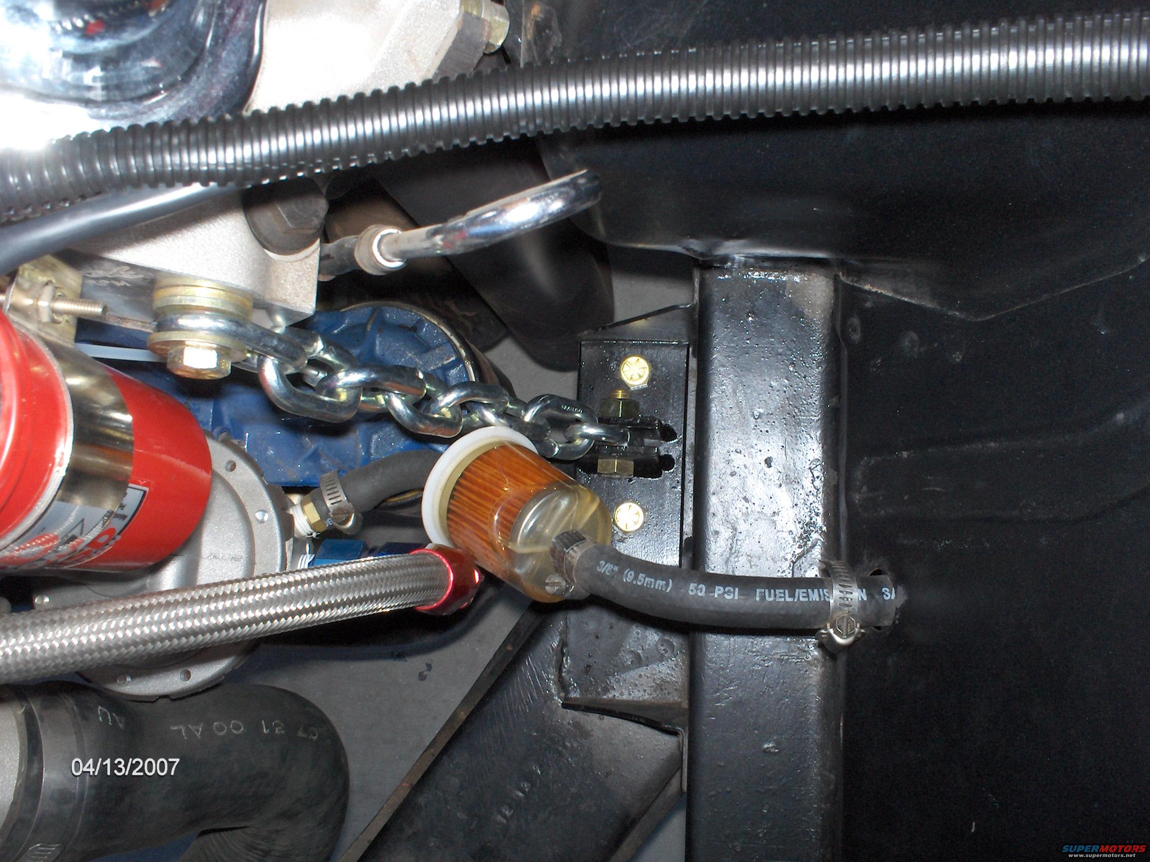 You can see the chain restraint Bob made to keep the engine from ripping the left side motor mount apart. It goes from the Edelbrock head to the Fairlane's chassis. There is barely any slack in the chain.