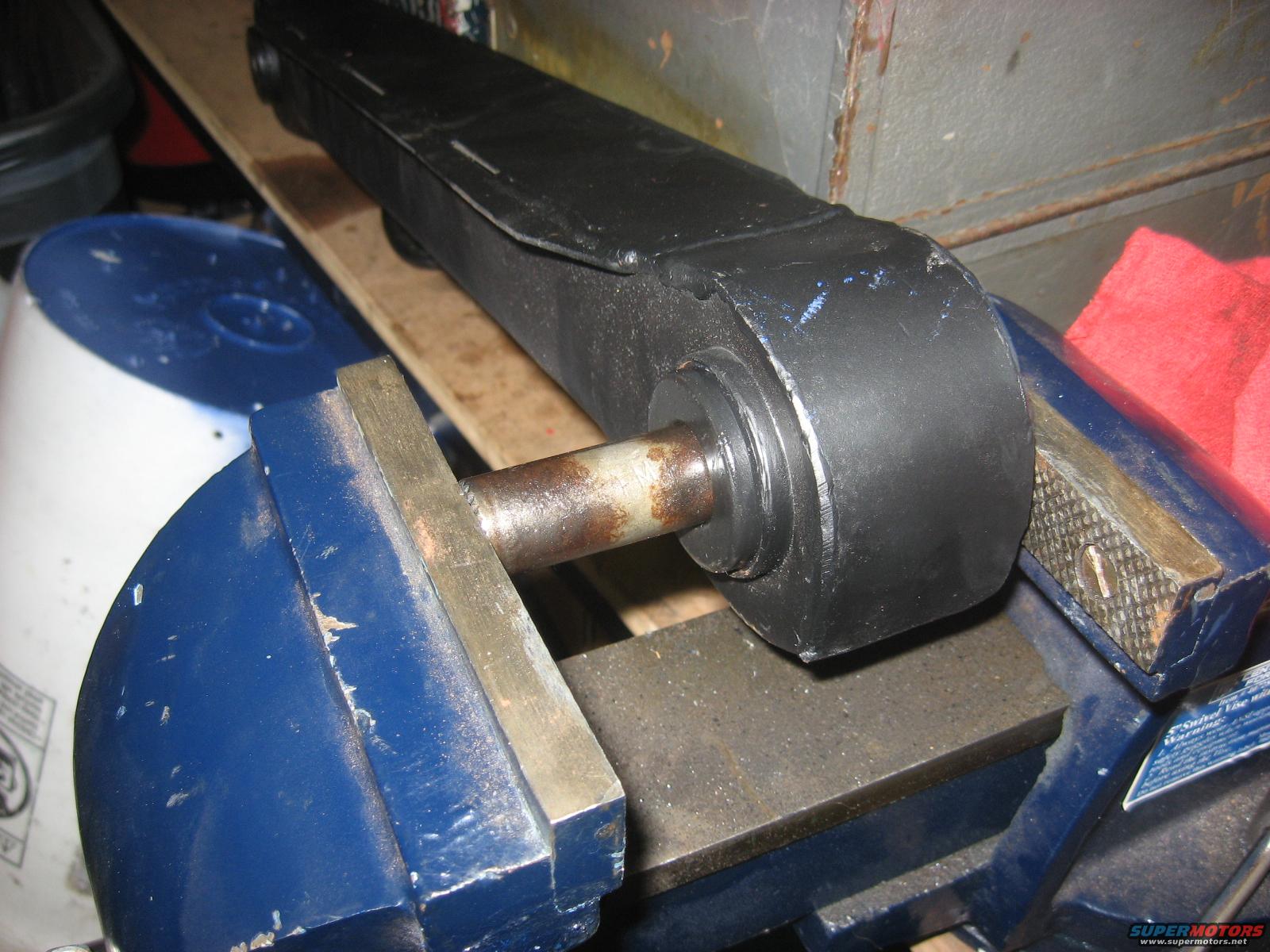 Slide the new bushing into the old shell in the control arm on both ends and then press the new inner barrel into the bushing. I drilled through the control arm boxed section with a bit large enough to slide the grease gun through. I then drilled a hole through the inner shell and all the way through the bushing. I installed a grease fitting into the inner shell. When you filling is installed it keeps the bushing from spinning and grease can get all the way to the inner barrel. If you don't grease these bushings regularly, then they will wear out.