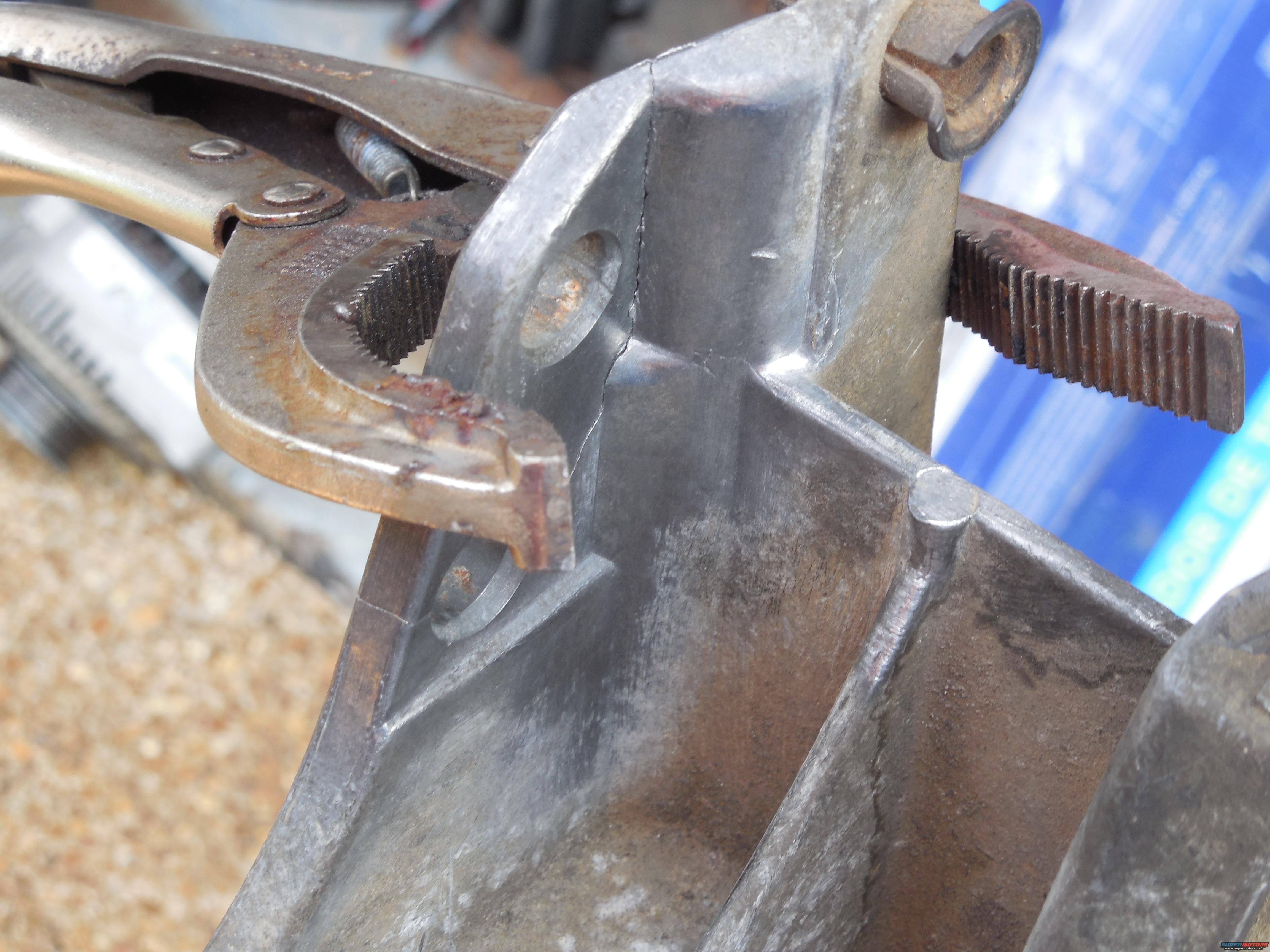 Rather than drive the CV to the JY to look for another bracket, I'll try to weld this one back together, mainly for the practice. If it breaks again, I'll replace it, but I need to learn. I cleaned the fracture & vicinity with stainless wire brushes that have never been used on steel, then used a small BP hammer to re-set the pieces together so the seam is minimized. The vise grips are just there for the initial tacks.