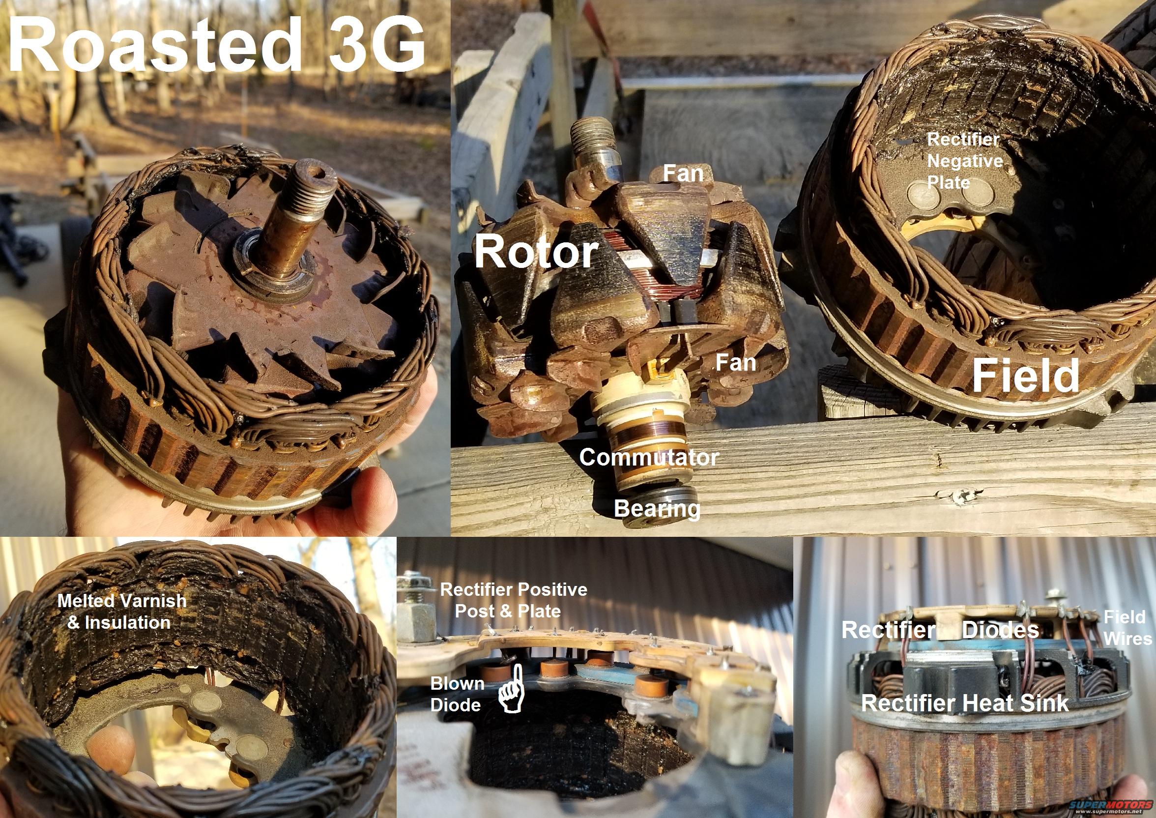 This is what happens when an alternator is run at max. output for too long. It can also happen simply due to age, which is why I suspect this one died. It came from the JY, so there's no telling how many miles are on it. I assume the diode blew first, causing all the other damage.