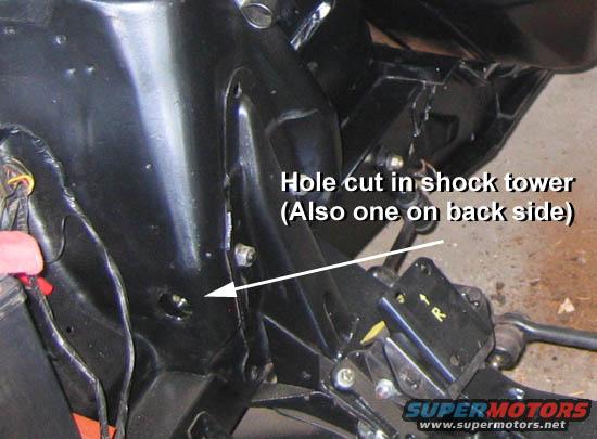 Hole torched in shock tower to access control arm zirc fitting. Installed by previous owner. I would have used a hole saw.