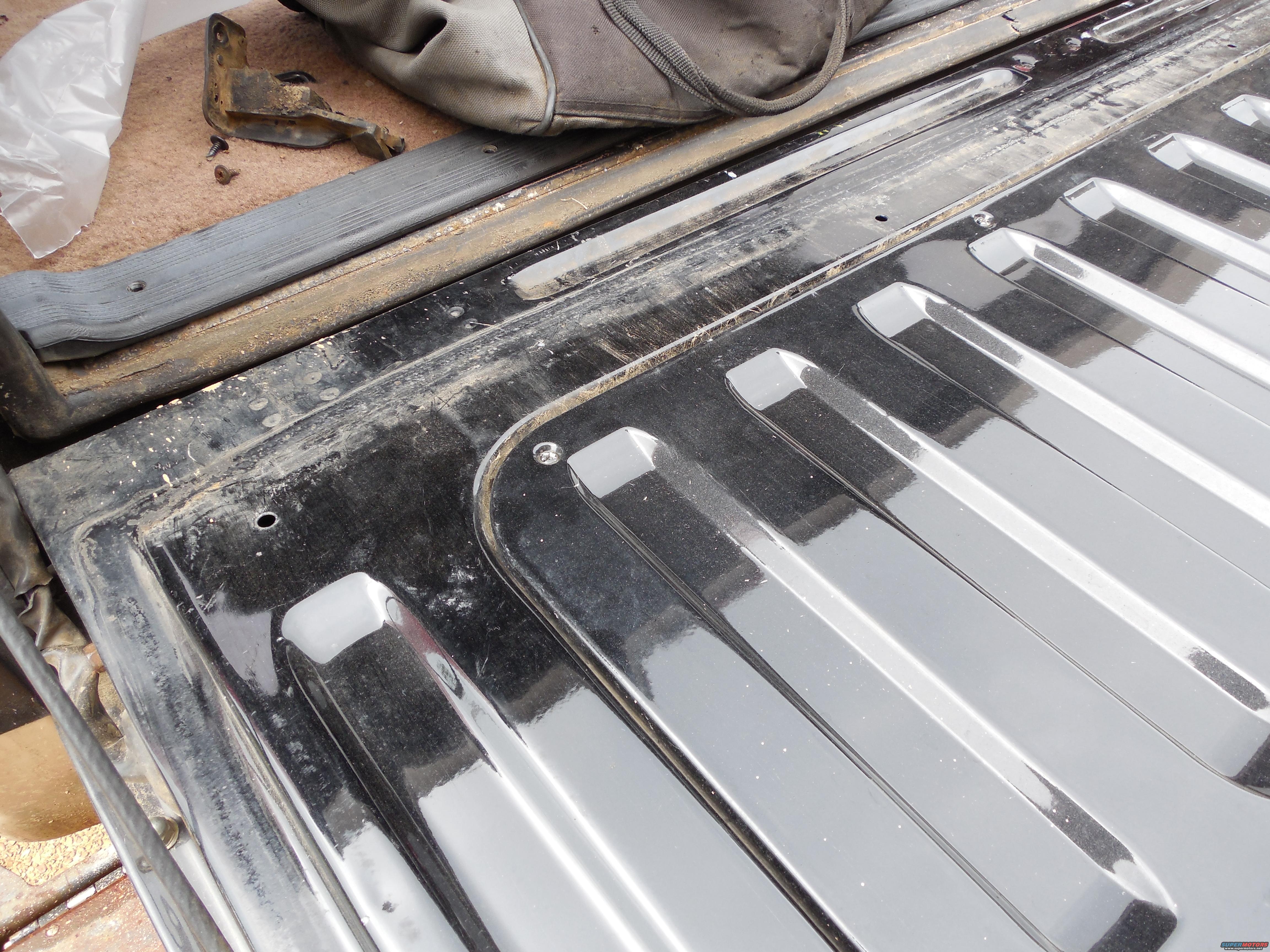 One of several signs that the t/g weatherbelts are ruined is rain coming out of the access panel and soaking the rear carpet. This can be difficult to notice if the ('94-96 only) t/g carpet is installed, but the trails are visible here. They appear because the factory painted paper water shedder is installed in the easy (WRONG) location, and it deteriorates rapidly.