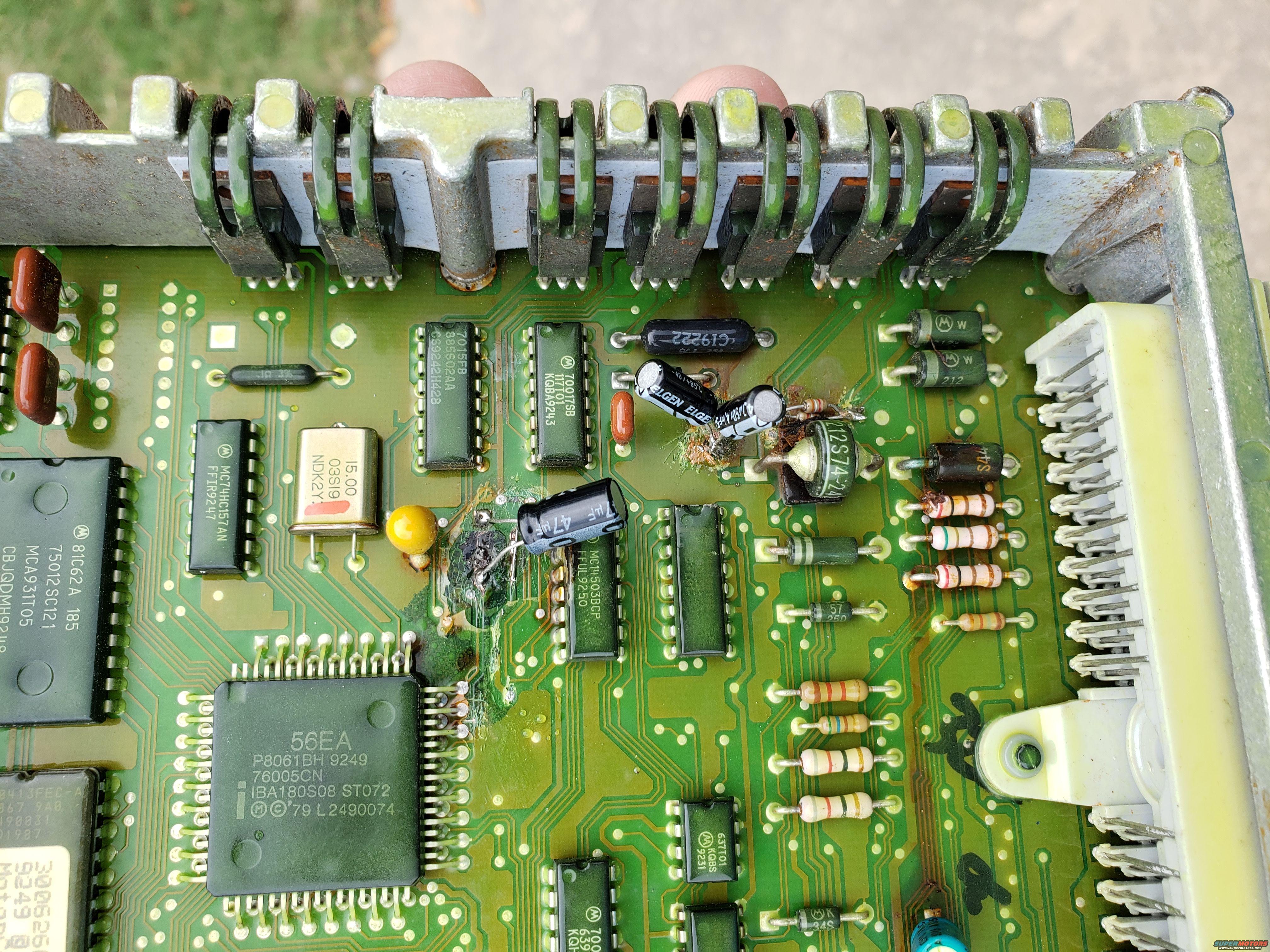 I dug around in my parts bins and scrapped together some replacement components and also fixed one trace that was open due to corrosion. Eureka, she runs! I had a code for MAP sensor which was because its vacuum line was tied to the A/C recirc. actuator instead of the manifold. No wonder they couldn't get this thing running right.