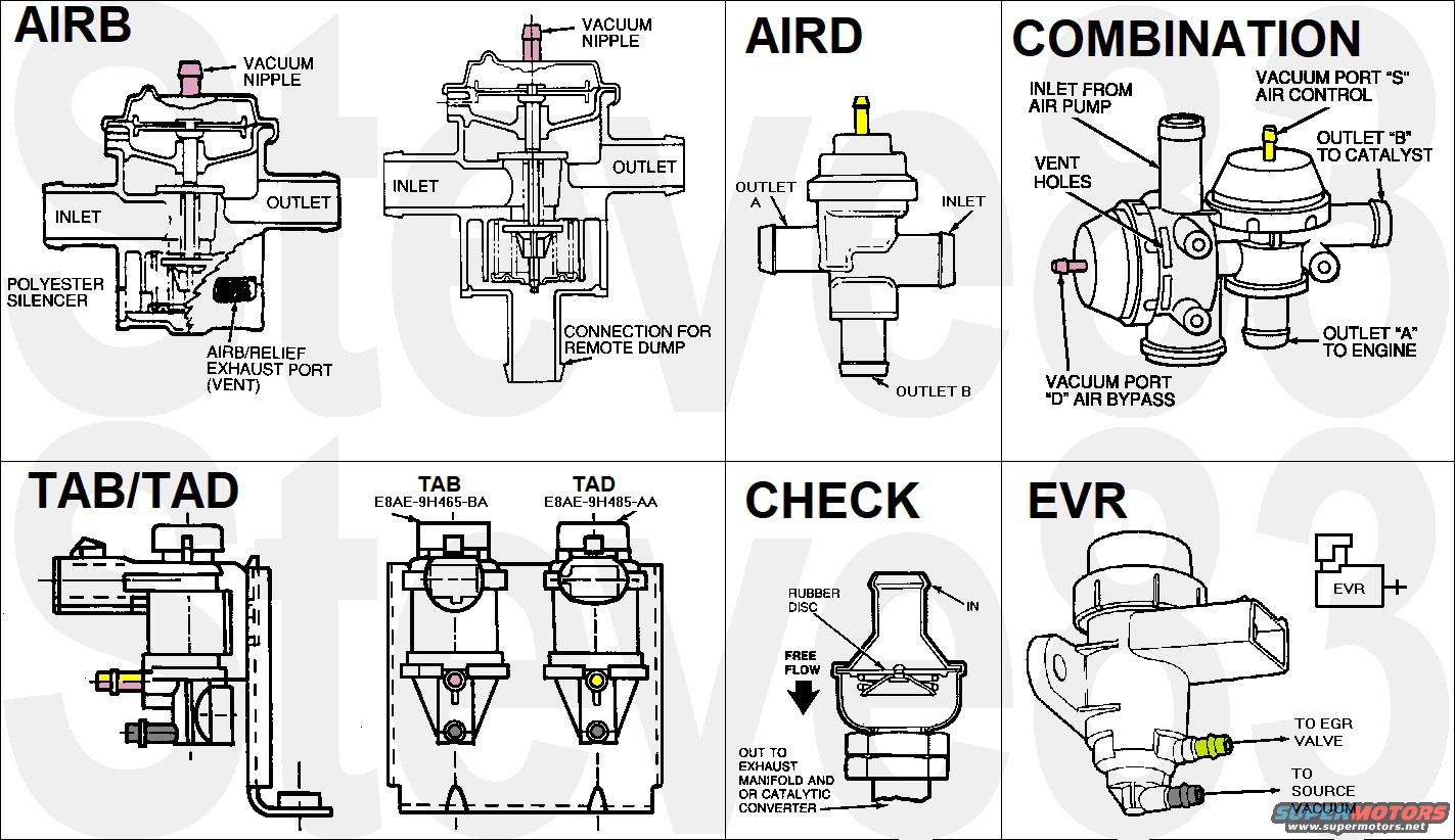 Secondary Air Valves & EVR (which has nothing to do with secondary air, but is a solenoid vacuum valve similar to the Thermactor Air Bypass & Thermactor Air Diverter, and is usually mounted beside them)