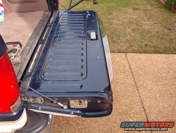 If the motor spins but won't move the glass (F2TZ9842006A), just push it down all the way, and you can open the tailgate. Never try to open or close the t/g with the glass sticking up as shown. It should be FULLY inside the t/g.