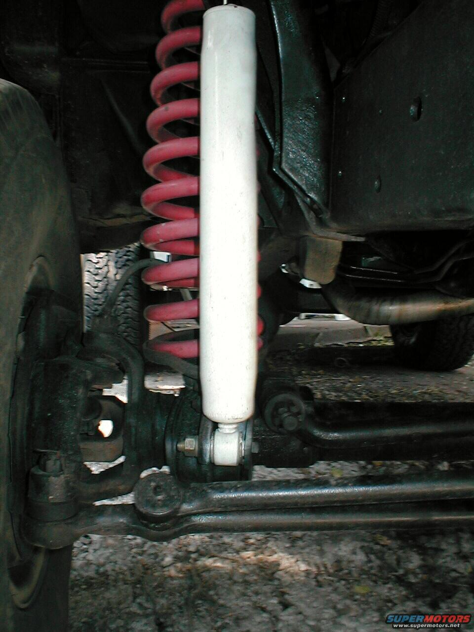 here you see that the lower shock mounts to the inner side of the mounting "ear" or "horn" that sticks out