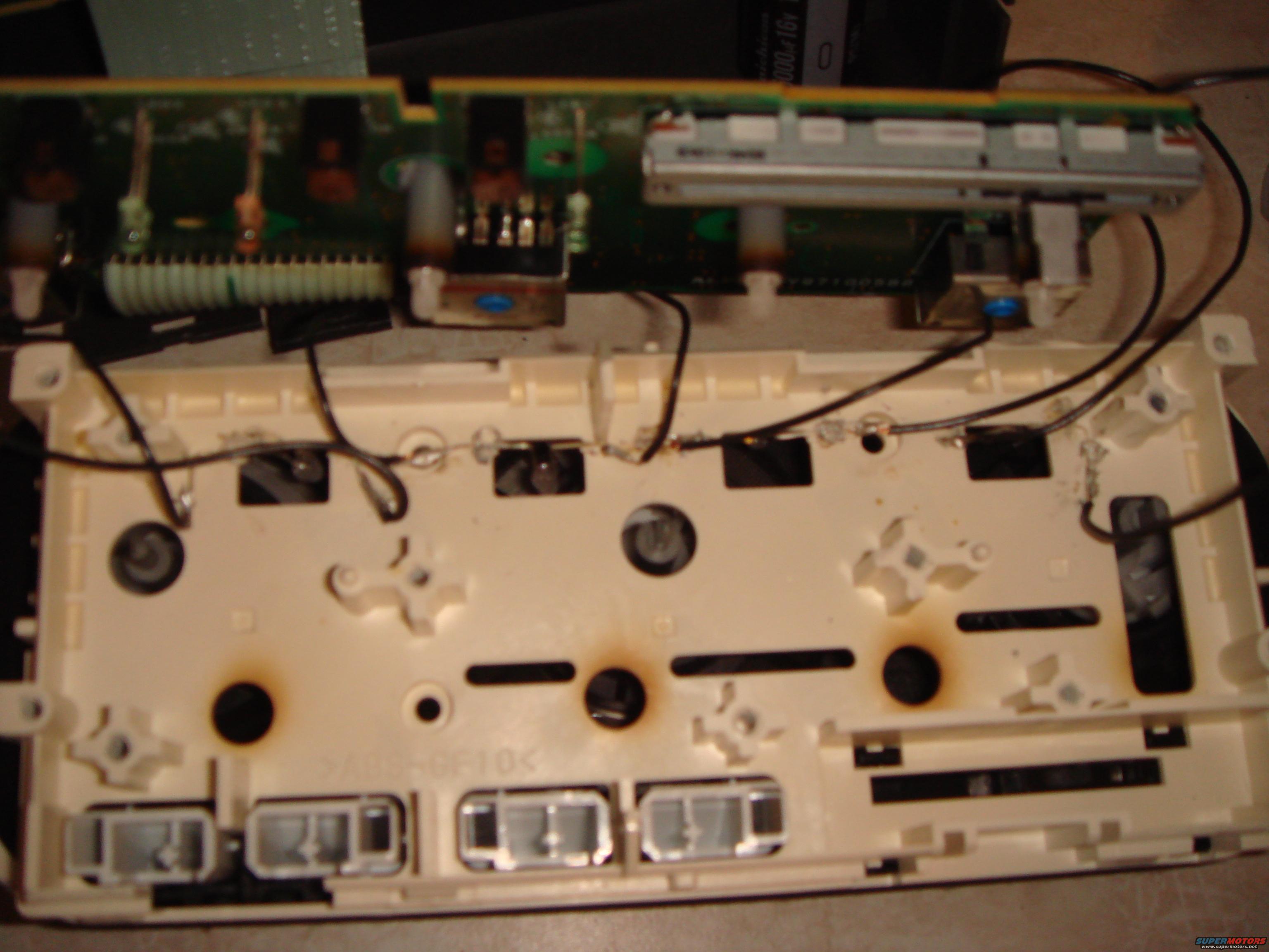 I added four LEDs in the square holes at the top of the climate control and wired them individually to the existing lights. To anchor them, use a hot soldering iron to melt the LED wire into the plastic.