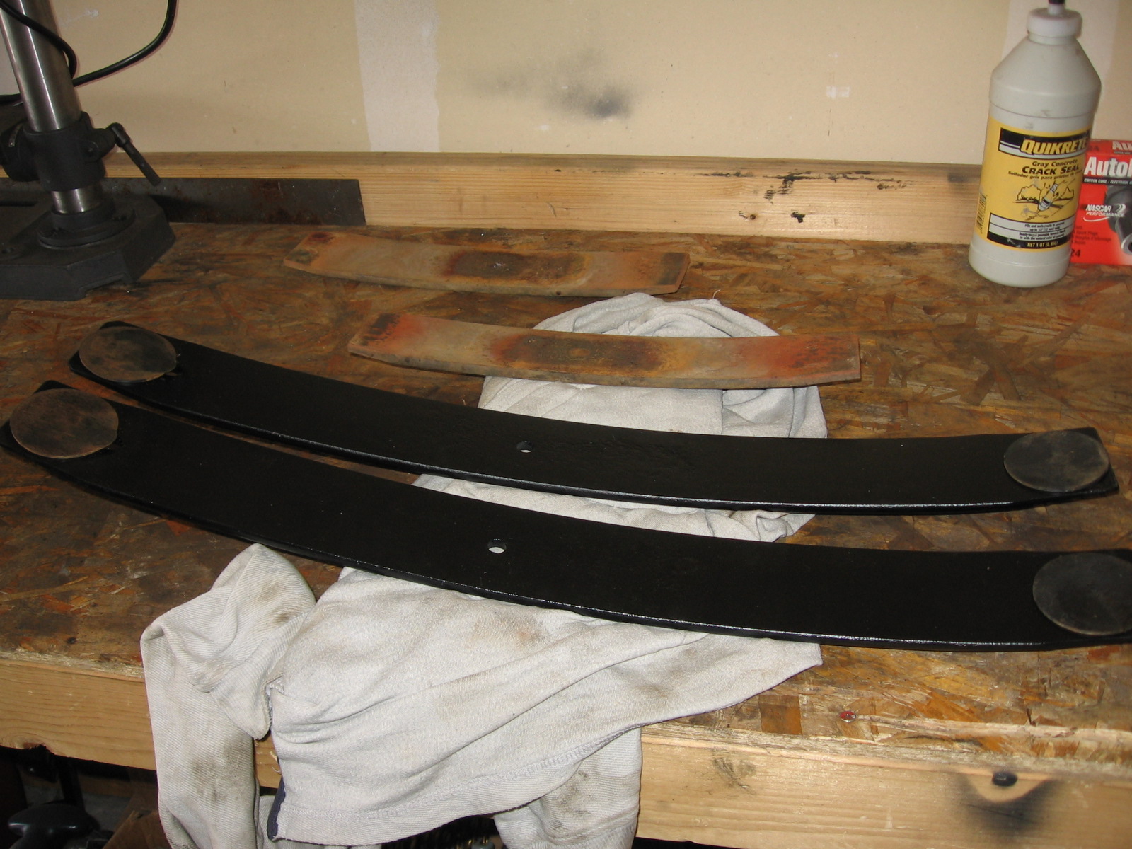 It's been several months since I installed the procomps, sans the massive overload, but plus the 1" ORD zero rate. Looks to me like I'd like to add at least a stock leaf, last one before the bottom. This leaf has the teflon pads and looks to match perfectly on the bottom of the procomp 5 leaf pack I have. I'm still kinda waiting since I want to conitinue to watch settling. As it it now, I would just add this 5/16th's thick leaf at the bottom, but only want to make this adjustment once, so if I get more settling, that rusty overload stocker is going back in as well once it's cleaned up. I've had about 3/8ths settling so far, so I suspect a little more, probably end up being 1/2" before it really sets.