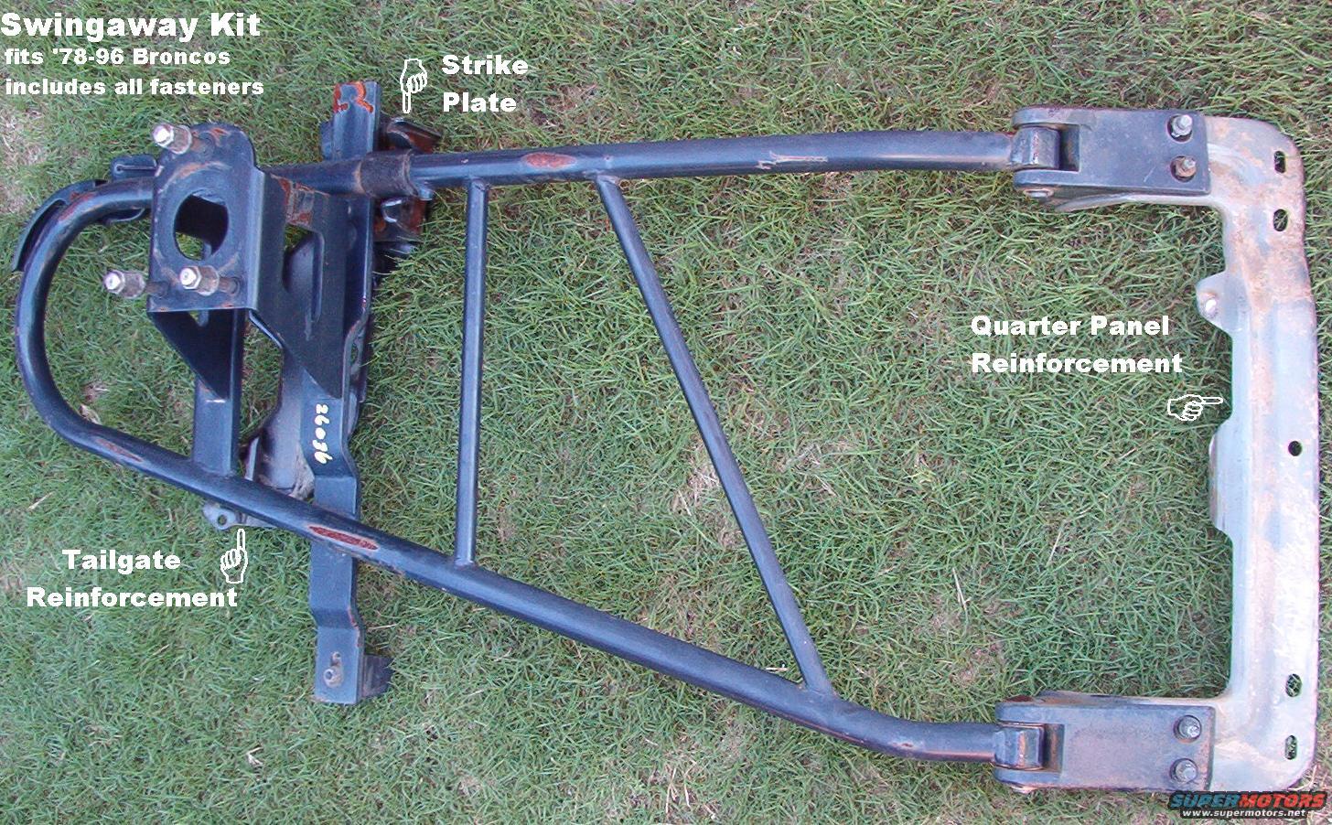 Includes all fasteners except the 2 bolts that are shared from the tailgate window regulator. If needed, I can disassemble, sandblast, & powdercoat the swingaway, pivot brackets, strike plate, & release handle.