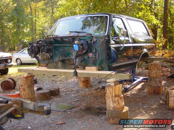 Our lifting method probably qualifies as "dumbest dang thing I ever done did," but there was no wind out, and we were extremely careful to stay in a position where we could move *fast* if the body decided it wanted to move to a lower elevation. Hard to see, but the back 60% or so of the body is supported by a hoist in a position that actually gives it pretty good lateral stability in the rear. It's actually resting about 50% on the blocks and 50% on the jacks and hoist at this point. We went for the lowest possible amount of lift that would allow us to roll the frame out.