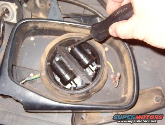 Being VERY careful not to crack the mirror glass (assuming it's still useable), tilt the mirror fully DOWN and INBOARD, and pry the outboard upper corner out of the head. Ford says to just pry until the mirror backing plate pops off the tilt ring, but I've never had one come off without shattering the mirror, so I always use picks to release the tabs. Working in good light, peek thru the gap between the mirror plate lip & the head housing. Use picks to gently release each tab by pulling it away from the central ring just a fraction. Sometimes, simply inserting the tip of the pick is enough.