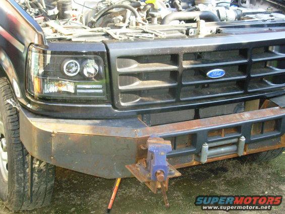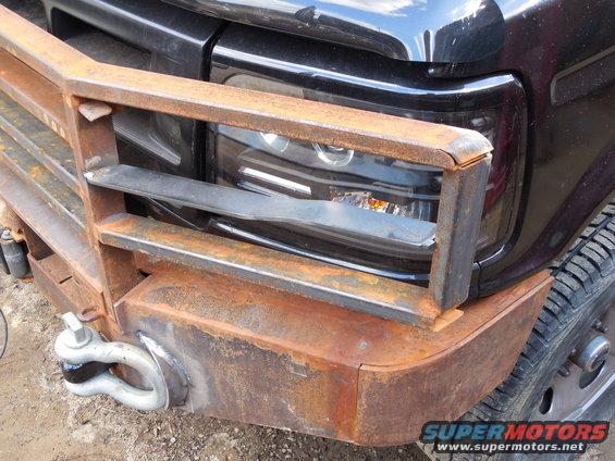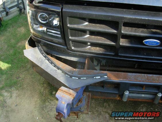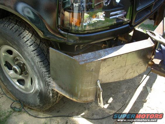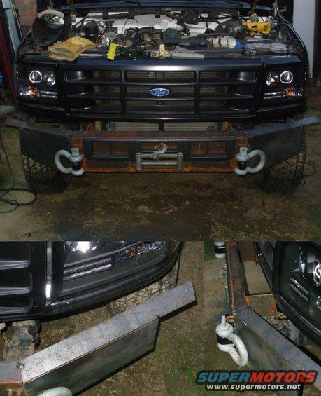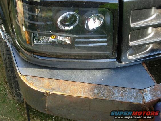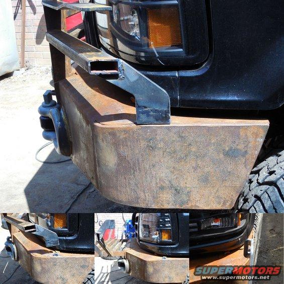 This went a lot faster than I expected - only about 4 hours including cleanup. I still may add a flat bar (1/4" plate) between the headlights & blinker, and a leg at each end going down to the bumper corner. IF THE IMAGE IS TOO SMALL, click it.  .  The top outer corners will be folded down when I have time to torch them into radiused bends. In addition to folding down, it's removable without tools (for either operation). UPDATE: It's at least as strong as I had hoped.  .