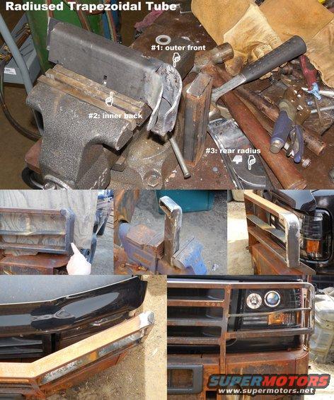 I removed the torch-rolled shackle keepers and installed these bandsaw-cut pipe crescents, which look & fit much better. And I added the headlight dividers.  The outboard vertical tubes are coming off the grille guard, in favor of some that I'm fabricating with a radiused top corner.