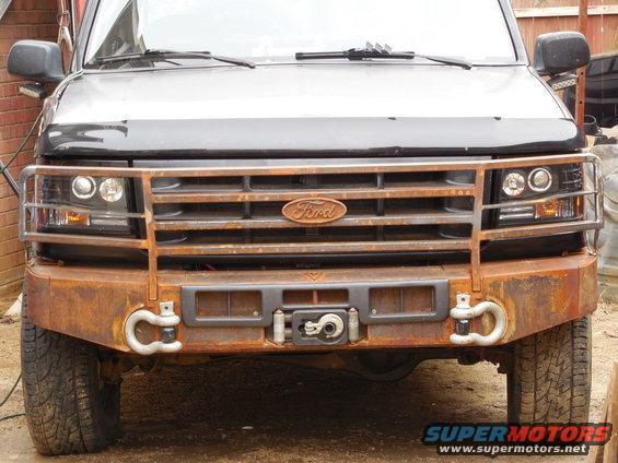 Looking good, but I still want to sandblast & powdercoat the whole front bumper eventually.  The aftermarket DOT-legal projector headlights work better than I expected, but the cheapo HID ballasts didn't last, so I'm using the included halogen bulbs. Chrome https://www.ebay.com/itm/274382325575 Black https://www.ebay.com/itm/273562204627The LEDs under the door mirrors also work better than I expected, and are very functional.  Unfortunately, the powdercoater I had been using went out of business. The bigger one can't do small jobs like this any more. And I've heard too much negative about the other to even risk it. One of these days, I might build my own oven. The big shackles are silent when I'm driving, secure when parked, and easy-to-use when wheeling. The grill guard has proven endlessly useful, and surprisingly sturdy; both hitting trees when up as shown, and hauling trees, deer, bulky parts, or passengers when folded down. The hook stows against the Daystar Isolator.