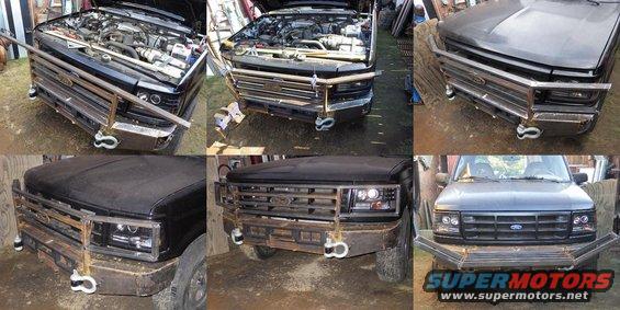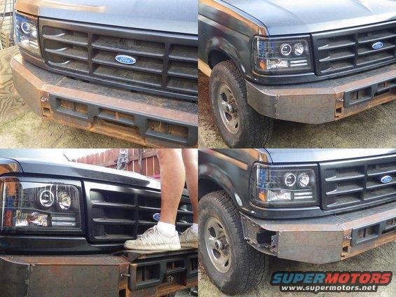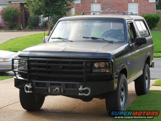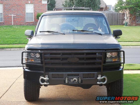 Looking good, but I still want to sandblast & powdercoat the whole front bumper eventually.  Unfortunately, the powdercoater I had been using went out of business. The bigger one can't do small jobs like this any more. And I've heard too much negative about the other to even risk it. One of these days, I might build my own oven. These DOT-legal headlights can be found on eBay as low as $150/pr shipped with halogen bulbs. The cheap HID kits don't last, or perform substantially better than the included bulbs. Search for FO2503114, FO2502118, or "1992 bronco halo projector". Chrome https://www.ebay.com/itm/274382325575 Black https://www.ebay.com/itm/273562204627The hook stows against the Daystar Isolator.