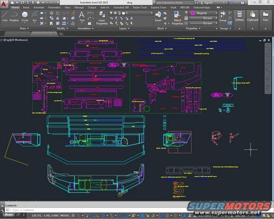 A screenshot of the CAD drawing for the revised front bumper. IF THE IMAGE IS TOO SMALL, click it. DraftSight is nearly identical, and produces top-quality DWGs (& acceptable PDFs) for $100/yr.