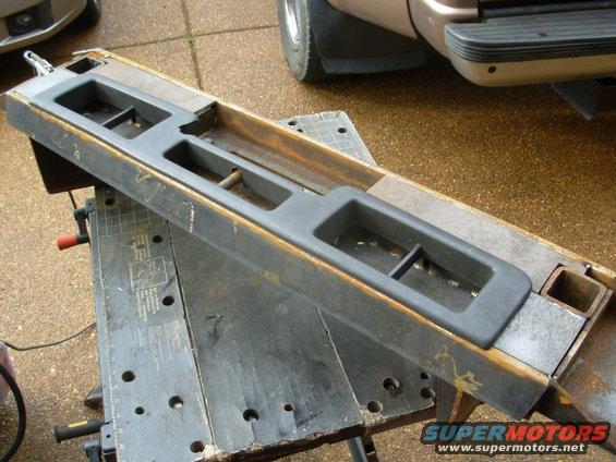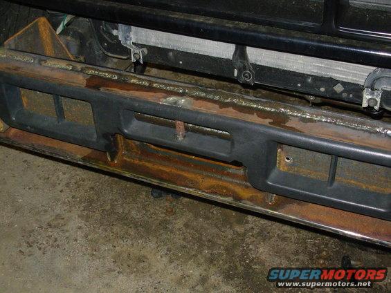 With the front plating & the structure that holds it in place, the center section of the bumper is now honeycombed, making it even stronger than the previous one. The plating also retains & reinforces the factory plastic trim. The hook-storage rod in the center replaces the plastic bar I removed from the trim. IF THE IMAGE IS TOO SMALL, click it.
