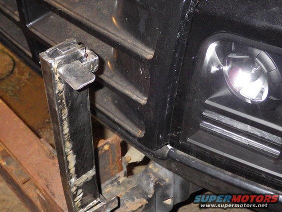 This leg will prevent the guard from being pushed back into the headlights. But the tab it fits onto still allows the guard to be tilted. Those door latch handles that I offset a few months back will still clear these. IF THE IMAGE IS TOO SMALL, click it.