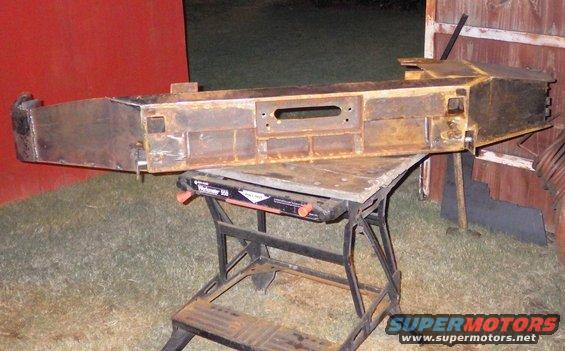 This is the plan: a C8x11.5 (just like the previous one) with some 1/4" plate attached by square tubes to the frame, and a fold-down tube grille guard (again). The black trim will be taken from a stock '94-96 bumper. The outboard sectons will be storage boxes (as before). But instead of recessing the shackles this time (which takes up some storage space), I'm putting them out front to help protect the fairlead, and for the styling. They may also be useful as cable guides for side pulls, or as steps. And their receivers will allow me to easily add temporary features, like a snow plow, or a tow bar. I may even add lights inside the shackles or trim.  .