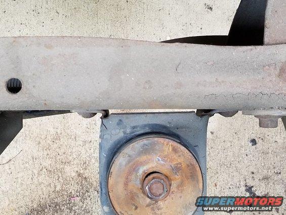 Coincidentally (I don't think it's crash-related), this body mount sleeve is seized. I couldn't knock it apart with an 8# sledge, which is why the bolt head is so mushroomed.