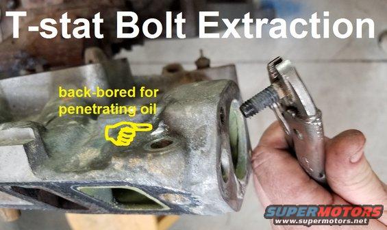 Drilling a hole into this blind boss to let some penetrating oil soak for a few days paid off. This bolt was the easiest (of the 8 that broke on this truck) to extract because it was sticking out enough to grab with vise-grips, and simply back out. Each of the others required substantially more work...  .  .