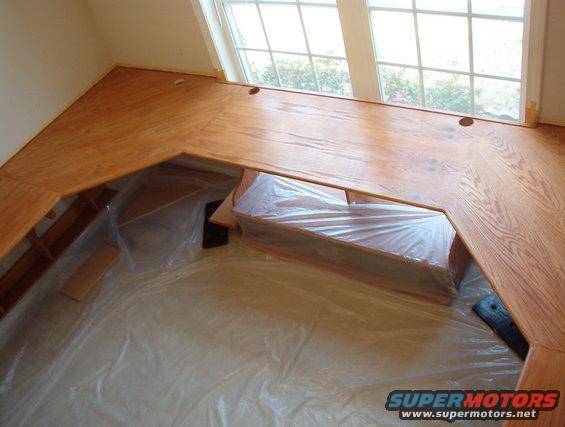 The 2 corner desktop pieces are only there to hold the window section in place. It's fully glued together now, and screwed to the wall. The carpet is cut out, so when the slab warms up a little, I'll glue it down. I've found the drawer slides I want, but I still have to build the drawers to go in the bottom.