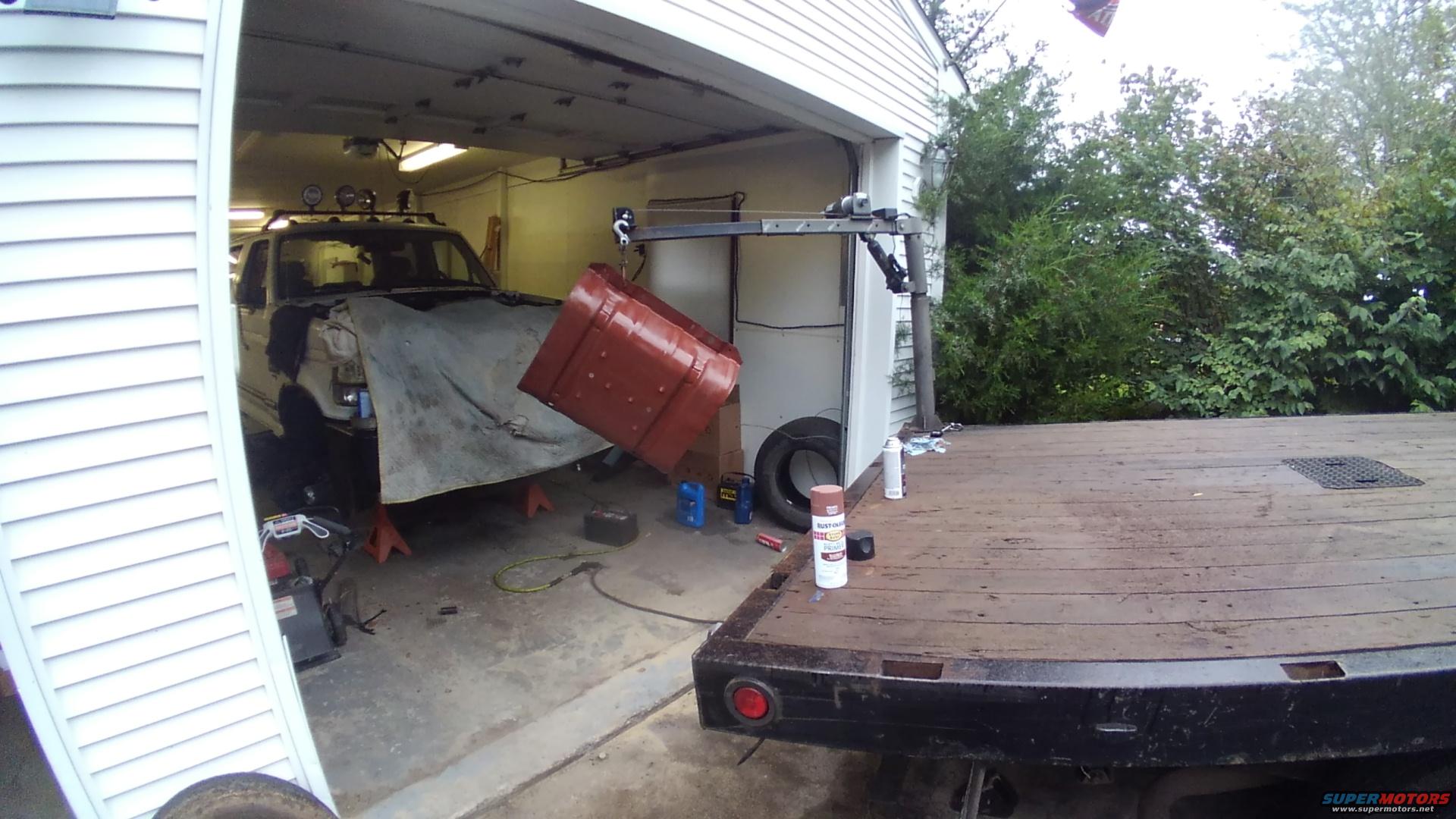 It started raining while I was painting it and every bay at my auto mechanic's shop was full so I couldn't hang it up in a bay to paint. So I had to get creative using my crane and covering my mechanic's Bronco so I wouldn't get over spray on it.