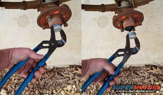 This is the tool Ford recommends for removing hammer-on grease caps. Tap the pliers with a small hammer near the grooves to work the cap out of the hub.