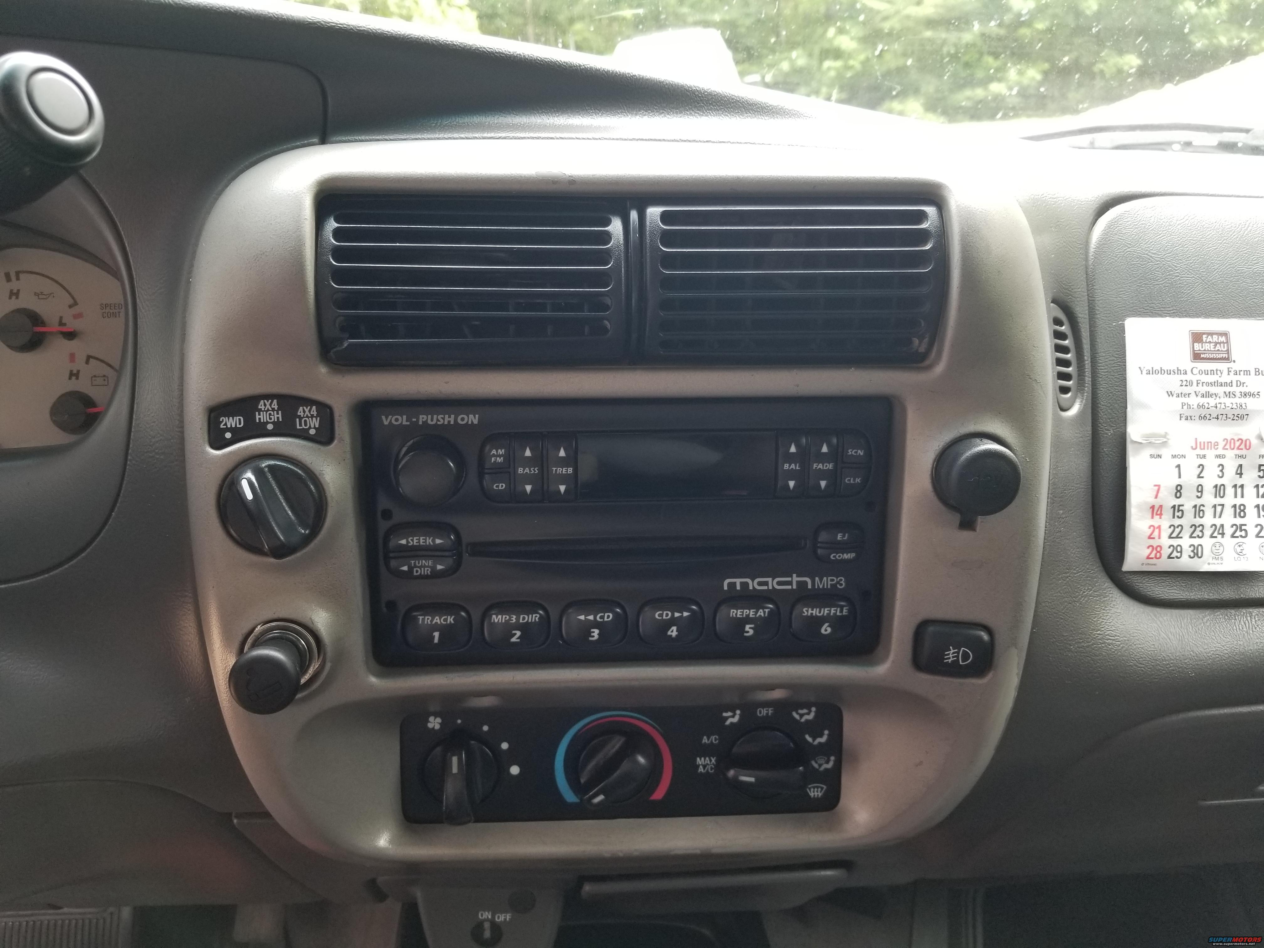 The center registers were broken, so after MUCH searching, a new Ford bezel (5L5Z-1004302-GAB) was installed. Later, the cigar lighter was swapped to a dual-USB voltmeter.