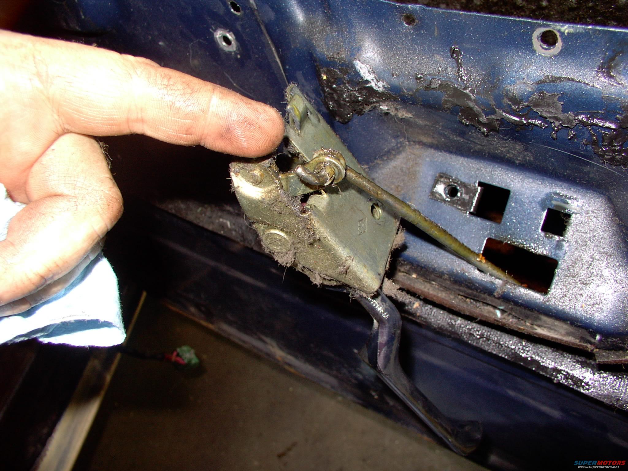 It's worth mentioning this rod has to come out of the inner door handle before you can remove the latch mechanism as a whole. Needs to go back in first too, before latch can be resecured to door.