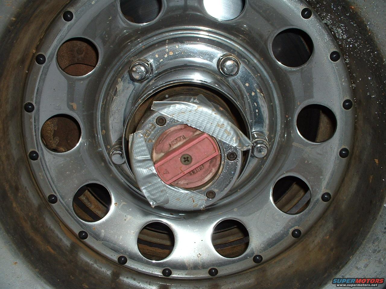Redneck Engineering at its best. I used some duct tape aroud the hub to keep water and mud out of the holes left from the bolts I lost.