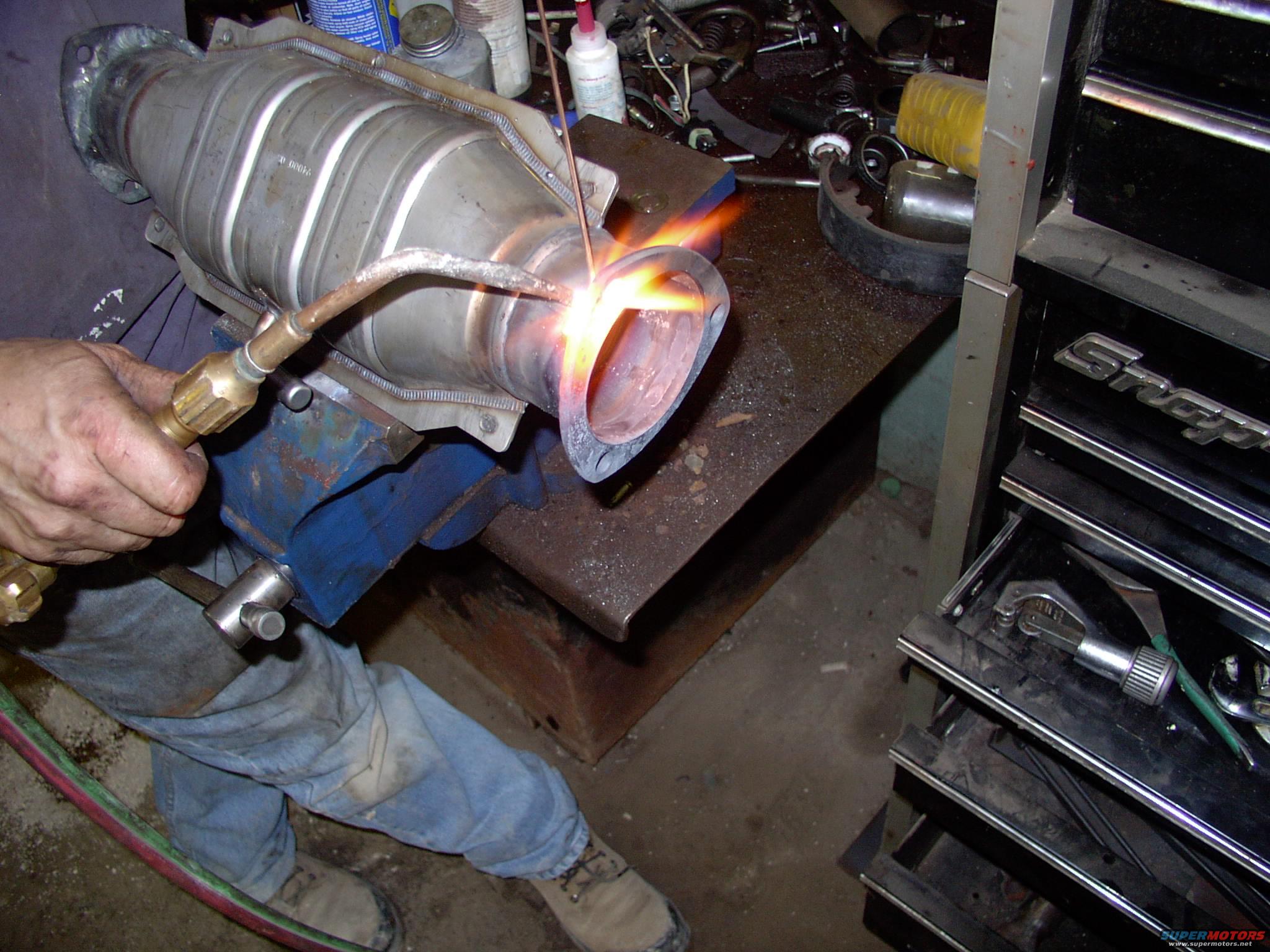 Now that we've clocked the header flange on the Y collector to the best setting for the Lincoln's chasis, my pipe bending buddy welds the header flanges onto the 3" cat.