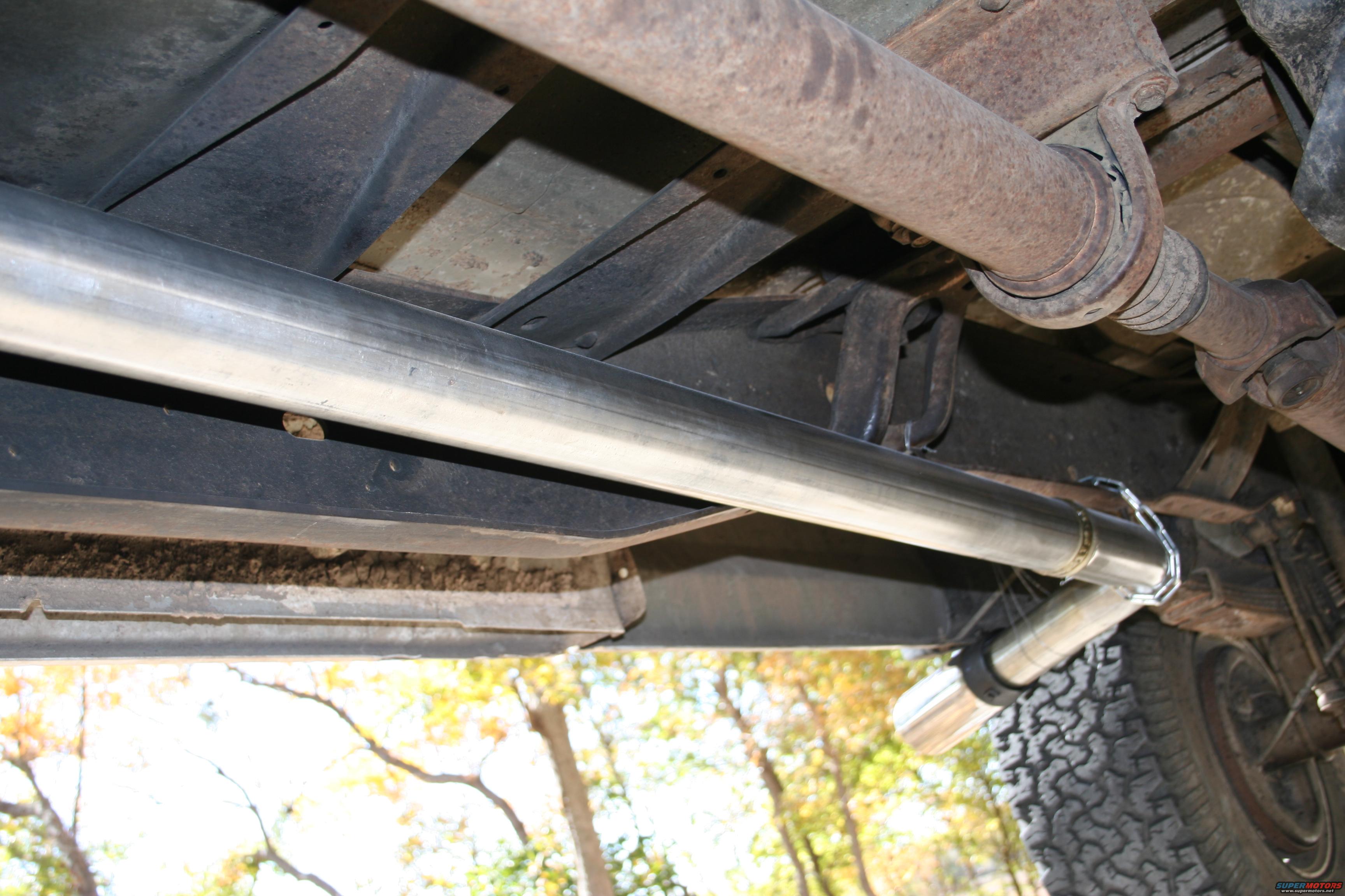 Underneath the truck. 3" ATS downpipe upgrade, then straight pipe, no muffler to a 60 degree bend out in front of the rear passenger tire. Sounds badass....