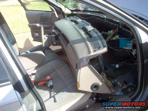 There's no need to disconnect the wiring or vacuum lines on the driver's side since this provides enough access to work. With the hoses & 3 nuts already removed, the box can now be pulled from the firewall. The top stud has a push-nut holding it to the firewall, but with firm force, it WILL slide off, releasing the box. There's no need to try to remove the servo or the nut on the inside end of the stud, but light hammering on the outside end of the stud may help. The push nut is between the outside box & the firewall, so the threads must be forced back thru it.