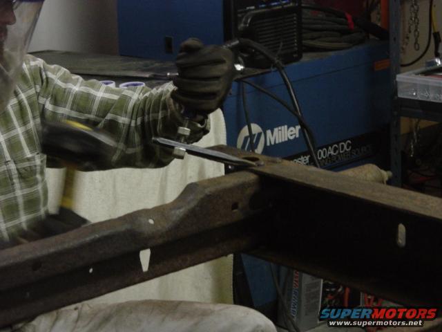 My aim's not really that bad, that's on the backswing. My prescription for frame rivet removal -- undercut the head as much as you can with a 3" cutoff disk, and then break out the 5/8" cold chisel and (depending on the angle) the 24oz ball peen or the 4lb drilling hammer (shown).