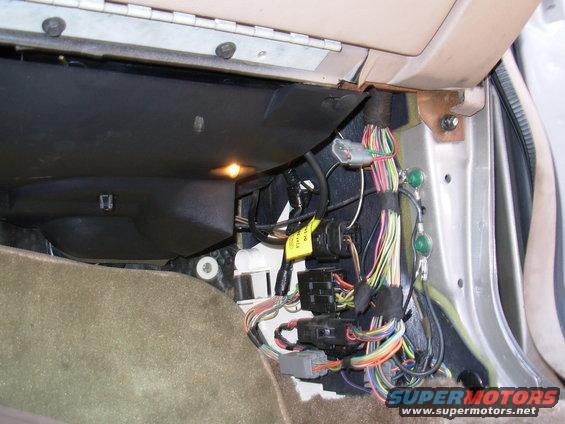 Remove the R kick panel for access to the underdash wiring. The antenna wire with the yellow tag runs to the dash frame below the far R corner of the glove box. To disconnect it, pull it straight forward, toward the engine. There may be a clip retaining it to the body further forward, so follow the wire & unclip it as needed. Then push the rubber grommet out thru the firewall, and remove the antenna base assembly.